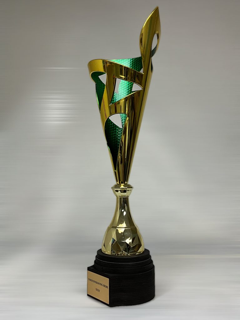 Introducing the Havana Gold & Green Laser Cup, a stunning addition to our ever-growing collection of modern awards. Crafted from high-quality plastic and elegantly mounted on a one-of-a-kind birch wood base, this trophy is a true work of art.