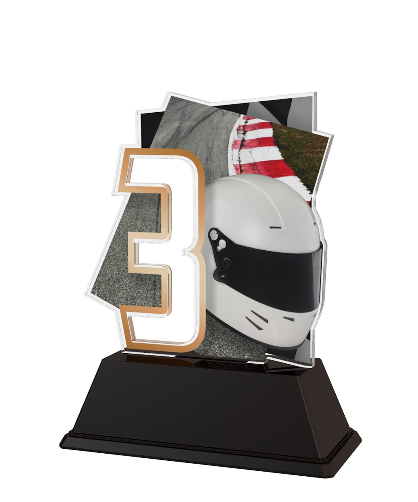 The Helmet Motorsports Number 3 Trophy is a modern take on a classic style award for 3rd place. Cut to shape this trophy features a high quality full color print on the reverse side of the 4mm thick acrylic mounted on a black PVC base. Size trophy 4 3/4".