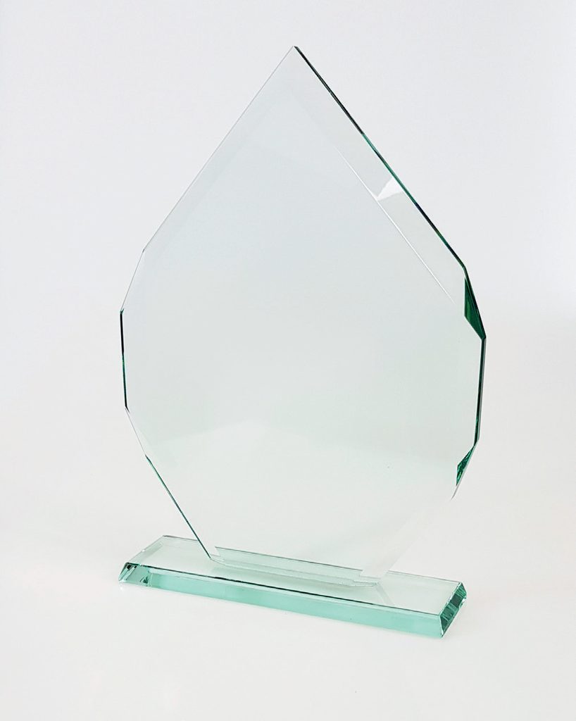 The Sarasota Jade Crystal Award is a modern designed high quality thick heavy bevelled crystal trophy mounted on a glass stand. Included is a FREE silk lined presentation box.
