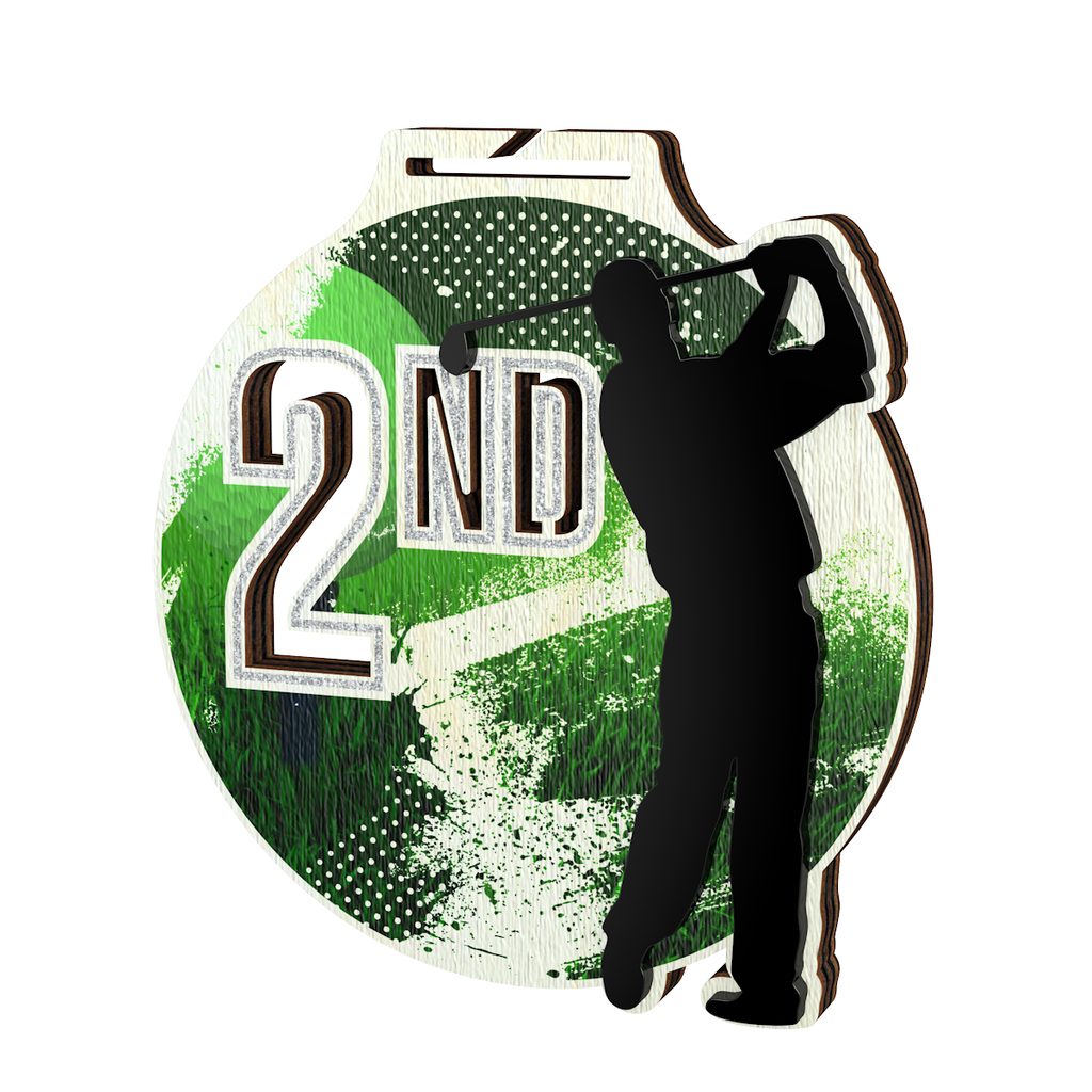 The Highgrove Fusion Golf 2nd Place Silver Medal a brand new concept design exclusively manufactured by Trophy Monster.  Made from a fusion of 0.3" thick 4ply real Birchwood and raised laser cut black acrylic. A stunning full colour print compliments a truly unique award.