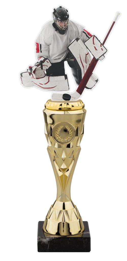 The Ice Hockey Acrylic Top Trophy is the latest in contemporary design. Watch eyes light up when presenting this award, with the high quality full colour print on the reverse side of 4mm thick acrylic mounted on an attractive gold plastic column, which itself is mounted on a black marble base.