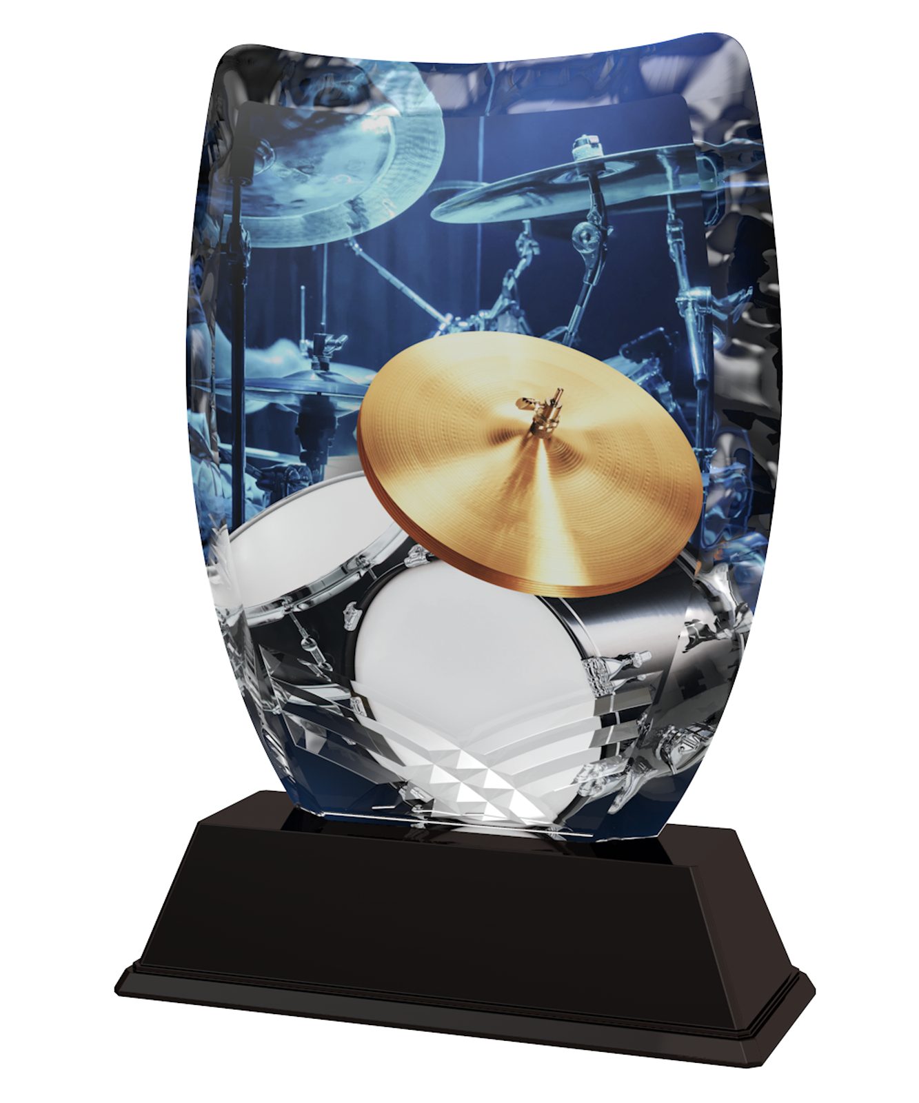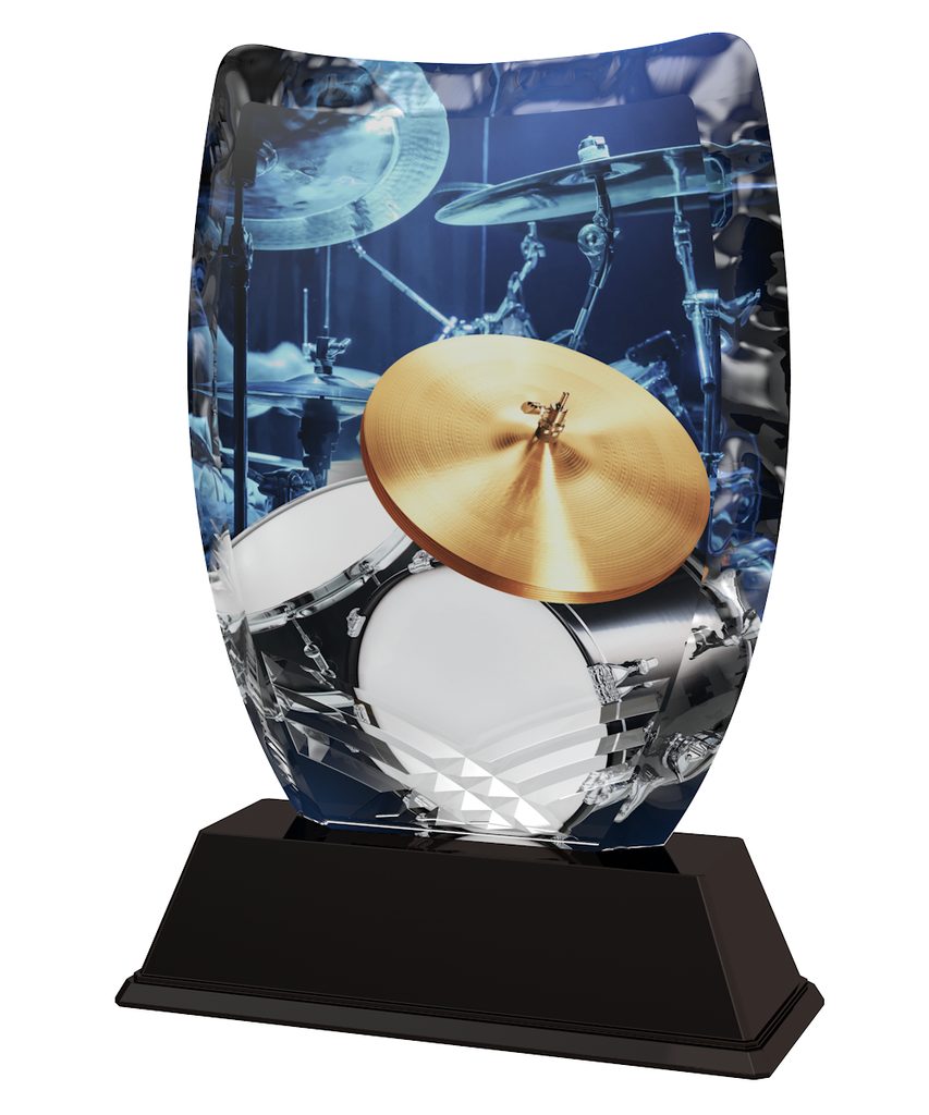 The Iceberg Drums Trophy is a modern style award. With superb shape this trophy comes to life with a high quality full color print on the reverse side of the 5/16" thick acrylic mounted on a black PVC base.