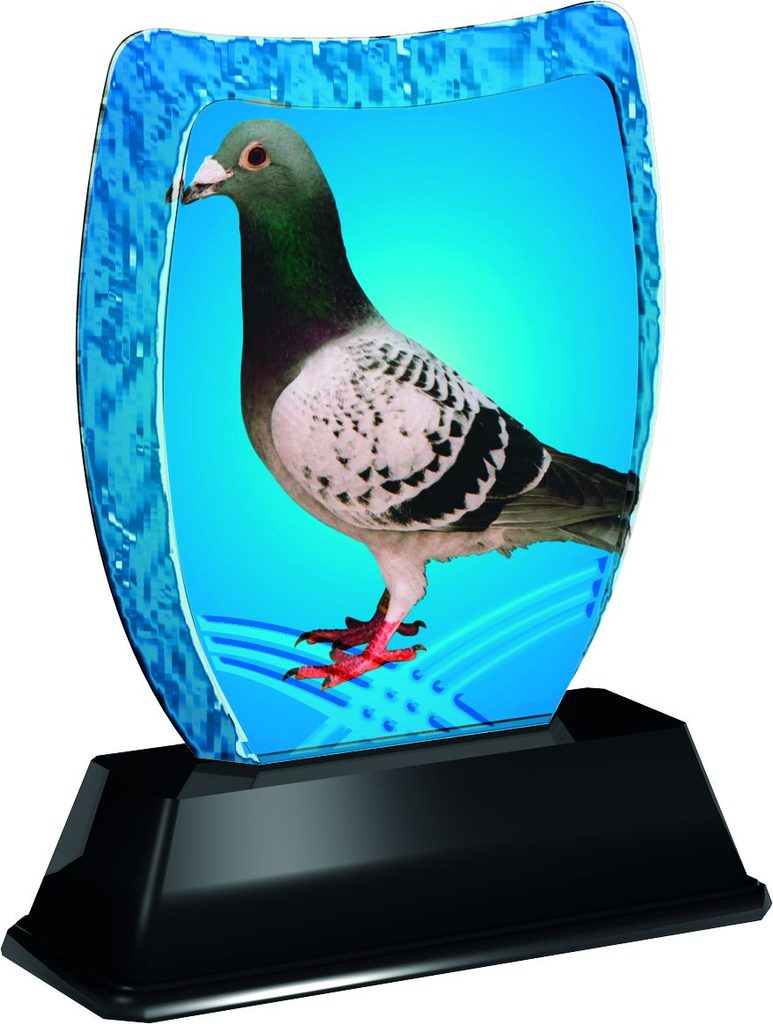 The Iceberg Pigeon Trophy is a modern style award. With superb shape this trophy comes to life with a high quality full color print on the reverse side of the 5/16" thick acrylic mounted on a black PVC base.