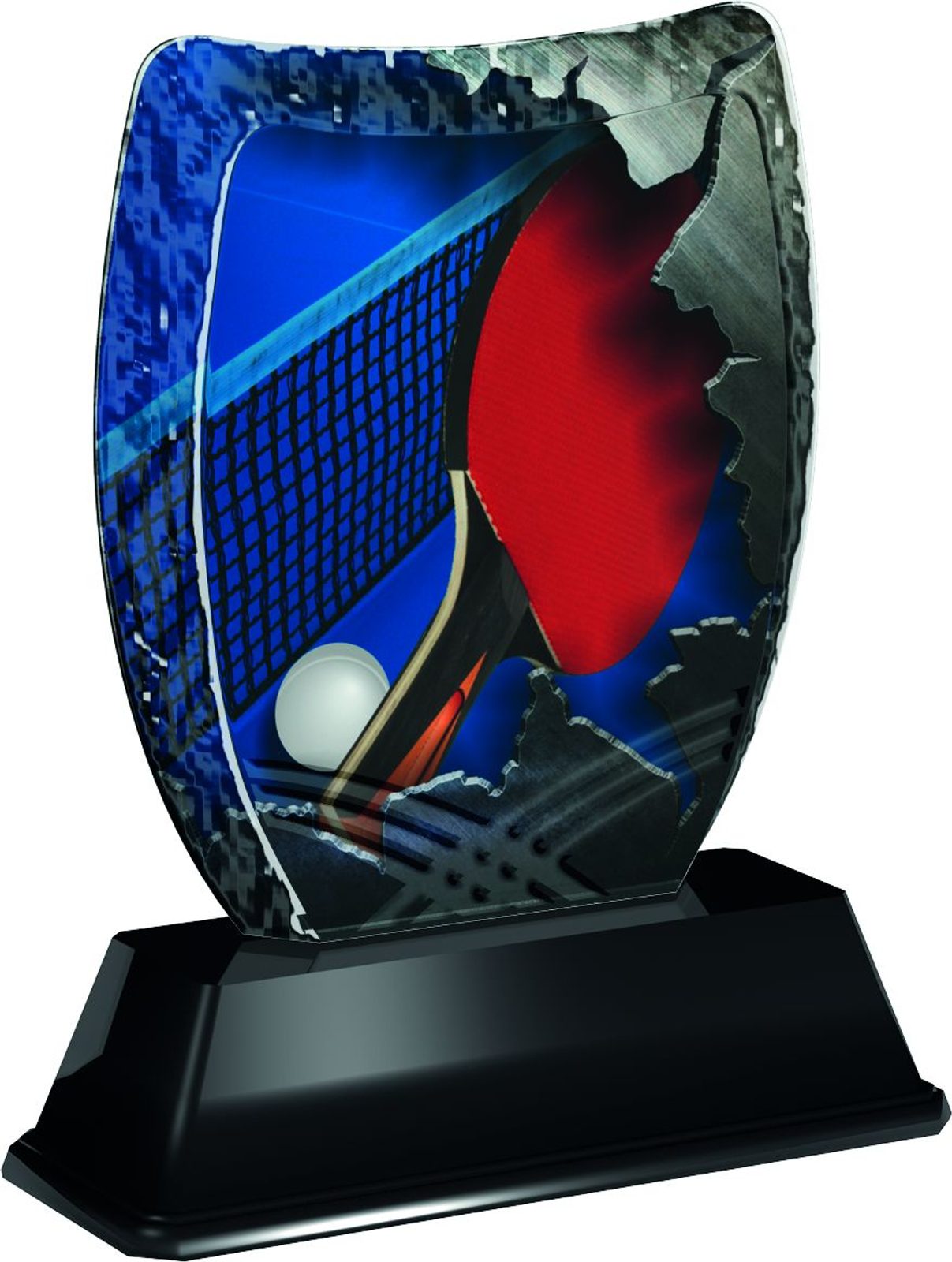 The Iceberg Table Tennis Trophy is a modern style award. With superb shape this trophy comes to life with a high quality full color print on the reverse side of the 5/16" thick acrylic mounted on a black PVC base.