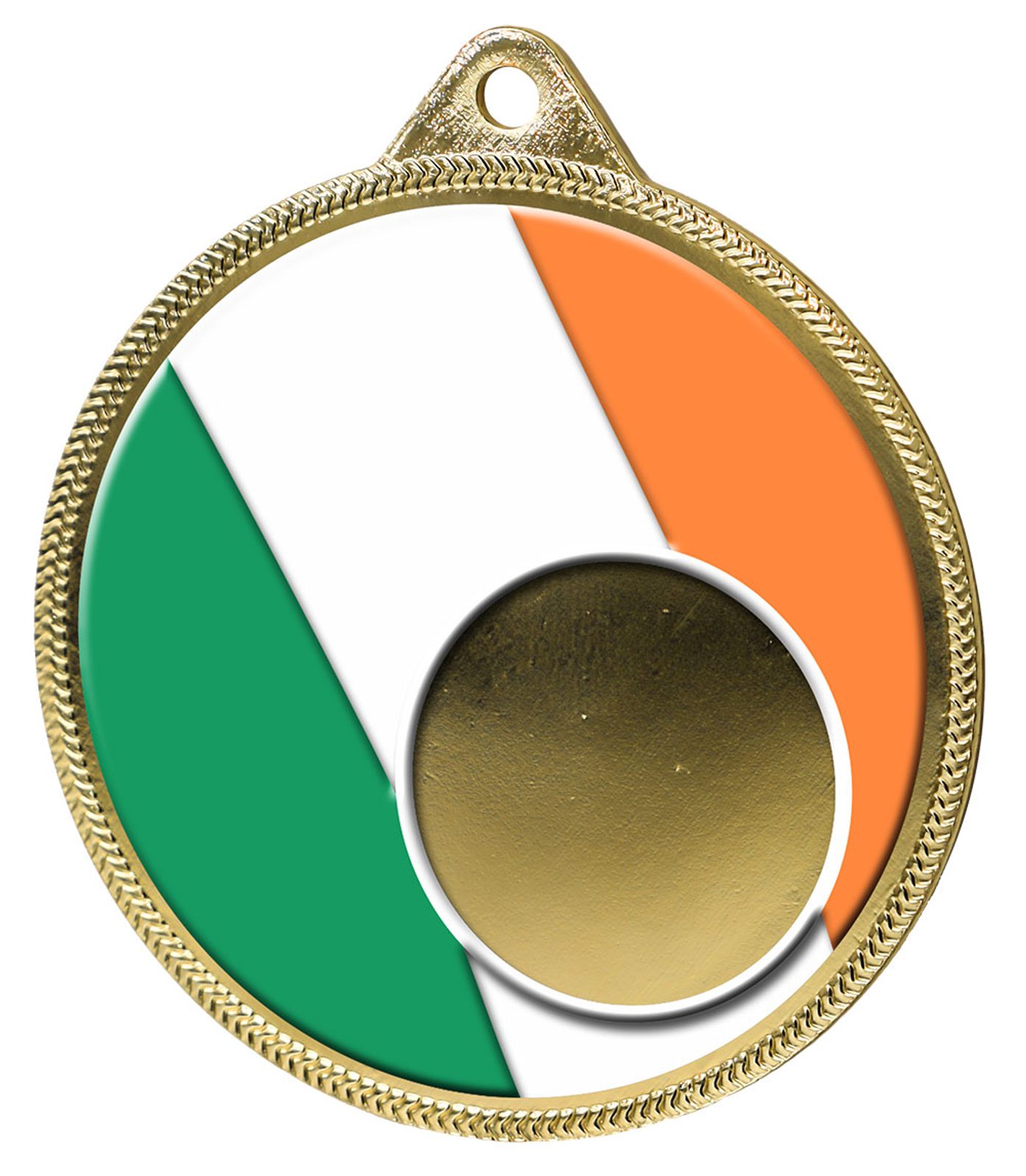 The Irish Ireland Flag Logo Insert Gold Medal is exclusive to Trophy Monster. Give out an irish medal to remember St Patrick's Day with this uniquely designed metal 2 1/8" medal. The medal has been printed using the latest 3D texture coating technology making the medal come alive with a vibrant raised full color print.