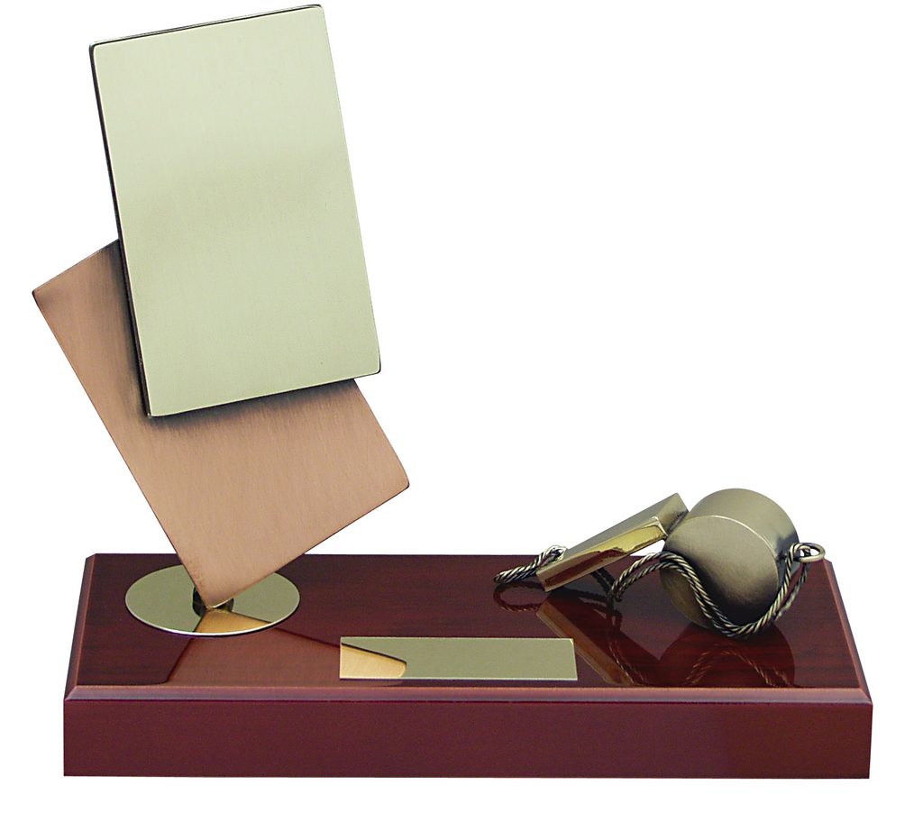 The Jaca Soccer ball Referee Trophy is an exclusive handmade metal award displaying red and yellow cards along with a whistle. This is then mounted onto a high quality polished wooden base. The award is part of an exclusive collection of awards that are handmade in Barcelona, Spain. Each trophy is hand crafted from high quality metals, including brass, copper, nickel, pewter and steel and are set upon either wooden or marble bases. The award also comes with a FREE engraved self adhesive plate with text of your choice. As this trophy is made to order, please allow 10 working days for import and delivery.