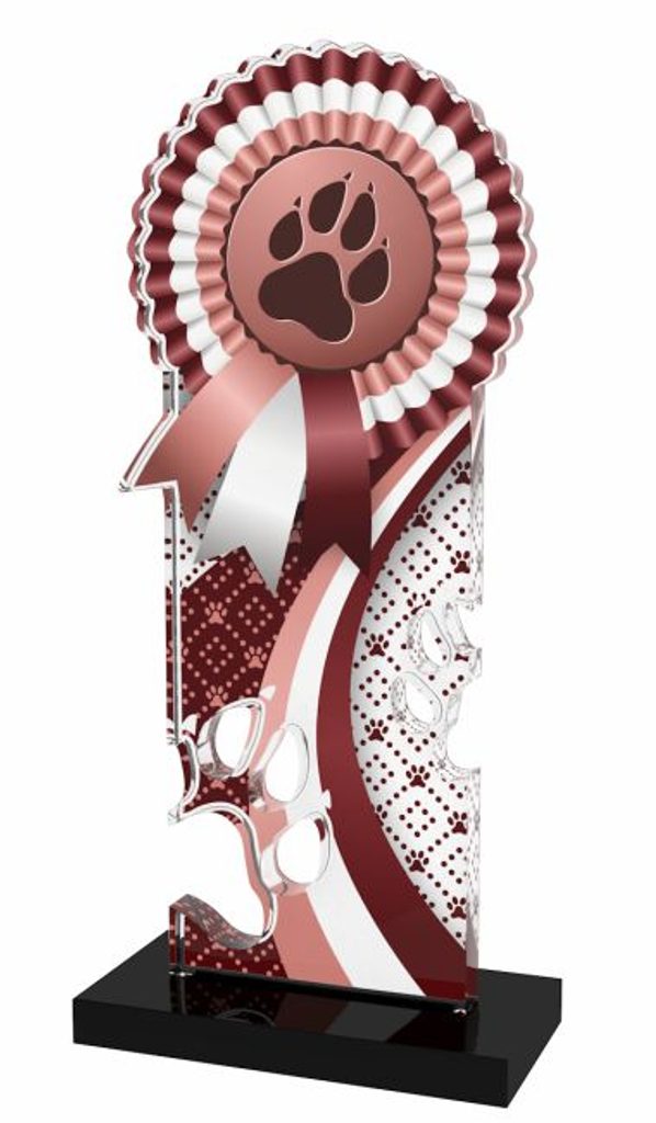 The Lassie Brown Paw-print Rosette Trophy is the perfect dog show award. Expertly cut to shape, this trophy features a high quality full color print on the reverse side of the 3/8" thick acrylic mounted on a black acrylic base.