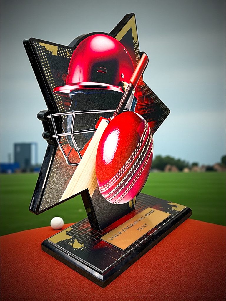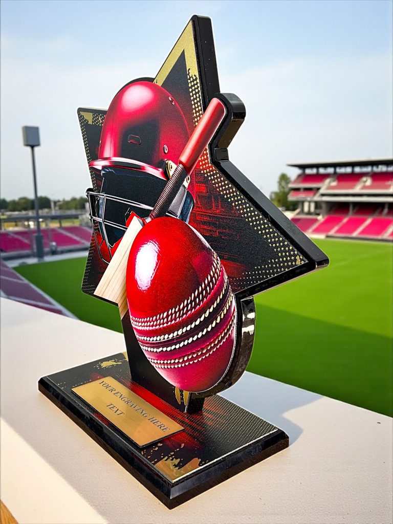 An elegant and original trophy made of 1/32" thick black acrylic. On the front, there is a finely detailed 1/25" thick metal design, created using a special 2D printing technology with varnish, which gives the design striking depth and shine.