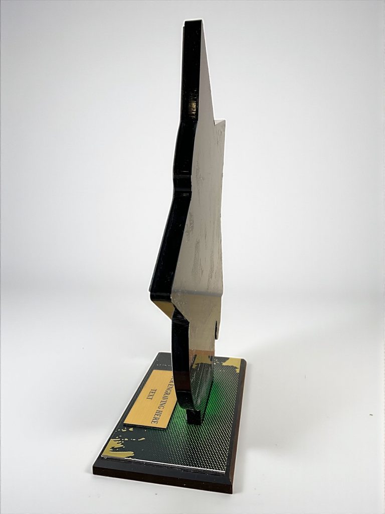 An elegant and original trophy made of 1/32" thick black acrylic. On the front, there is a finely detailed 1/25" thick metal design, created using a special 2D printing technology with varnish, which gives the design striking depth and shine.
