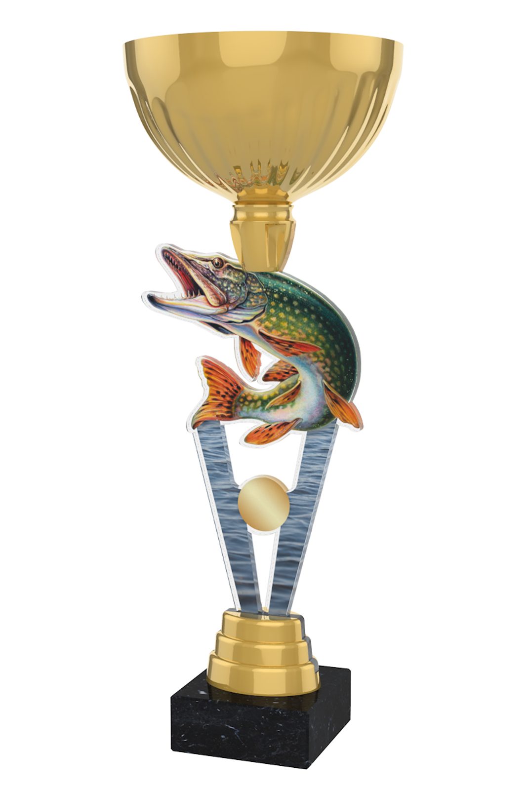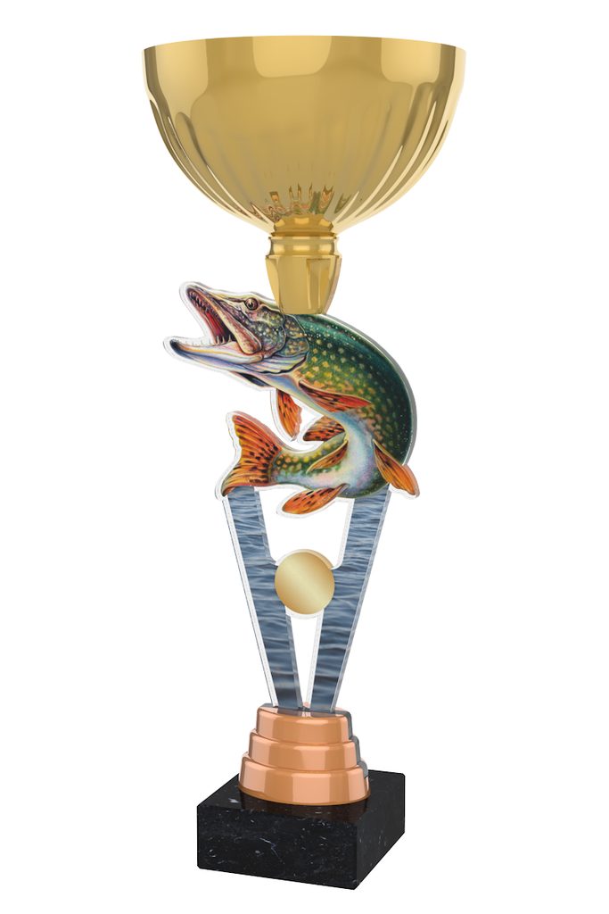 The London Fishing Cup Trophy has a centrepiece featuring a double sided full color print on 0.25" thick acrylic. Fixed to a metal bowl, the cup is then mounted onto a black marble base. Please select which color riser you like from gold, silver or bronze. The riser sits just above the base.