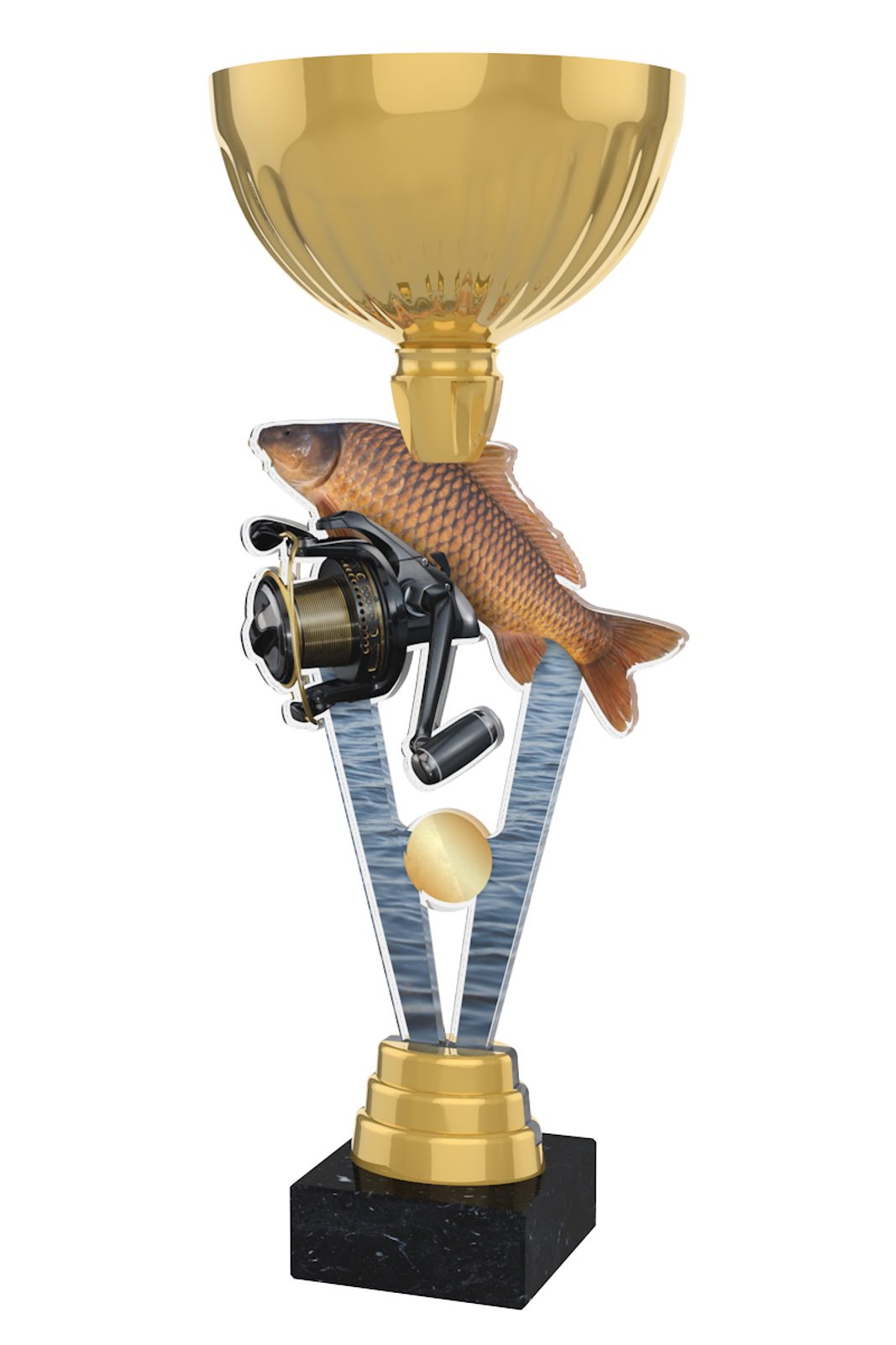 The London Fishing Reel Cup Trophy has a centrepiece featuring a double sided full color print on 0.25" thick acrylic. Fixed to a metal bowl, the cup is then mounted onto a black marble base. Please select which color riser you like from gold, silver or bronze. The riser sits just above the base.