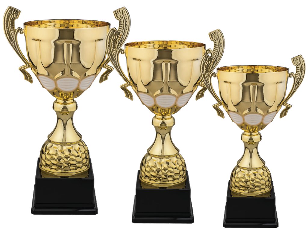 The Luxury Gold and White Cup is a luxury silver contemporary award. Consisting of a black weighted plastic base, with a gold plastic column and a deep gold metal bowl with silver details. Comes in 3  sizes 19.5",17", 16".