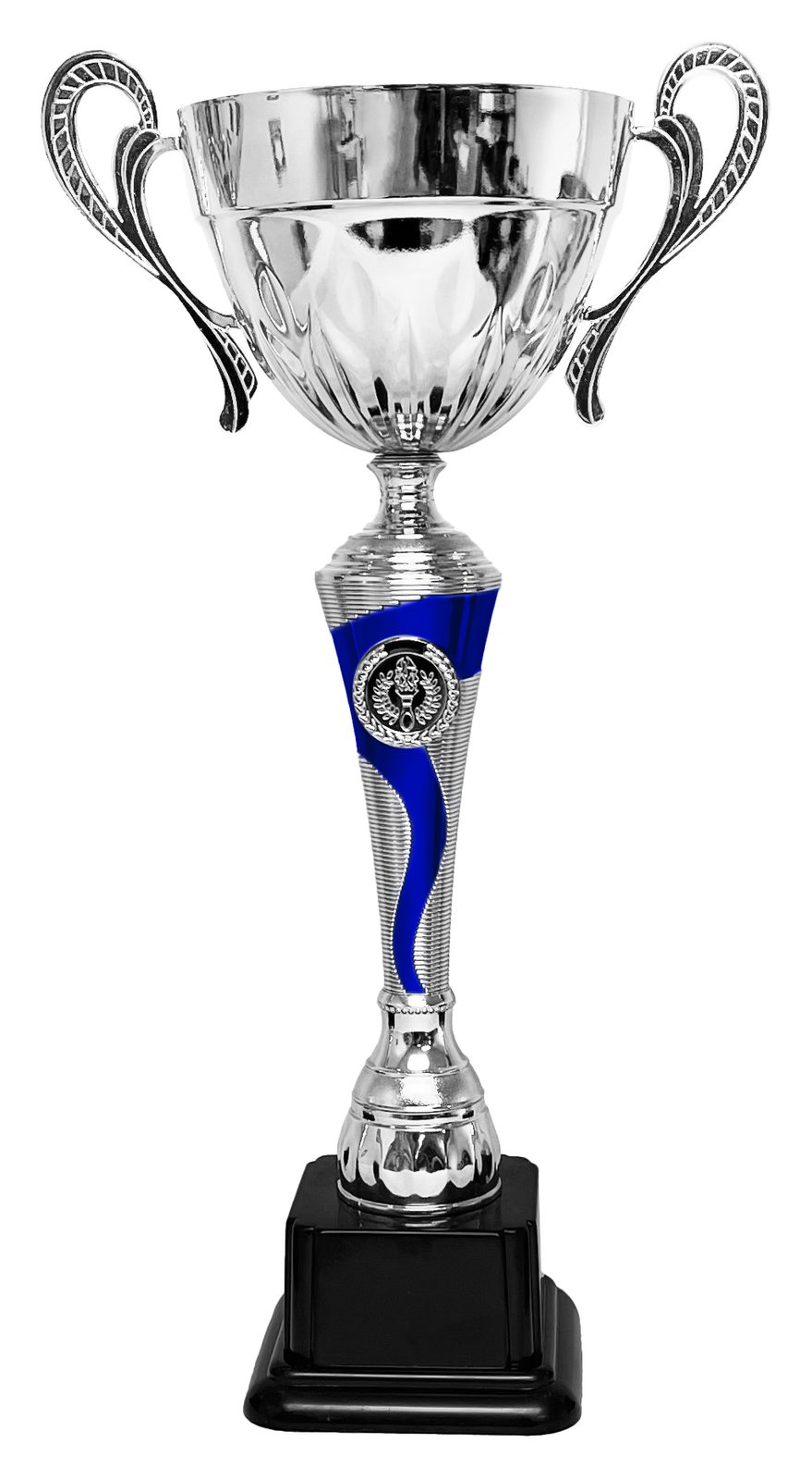 The LXL2022/01 Silver and Blue Cup is an elegant trophy cup award. Made from a large metal bowl with ornate handles mounted on a plastic column. The cup is then fixed to weighted PVC base.  Select from 3 sizes.