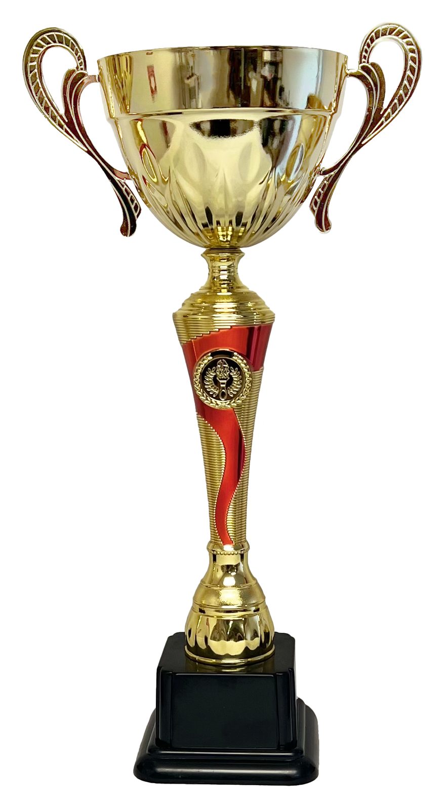 The LXL2022/02 Gold and Red Cup is an elegant trophy cup award. Made from a large metal bowl with ornate handles mounted on a plastic column. The cup is then fixed to weighted PVC base.  Select from 3 sizes.