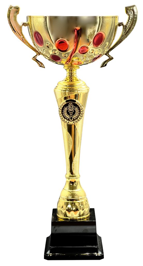 The LXL2022/05 Gold and Red is an elegant trophy cup award. Made from a large metal bowl with ornate handles mounted on a plastic column. The cup is then fixed to weighted PVC base.  Select from 3 sizes.