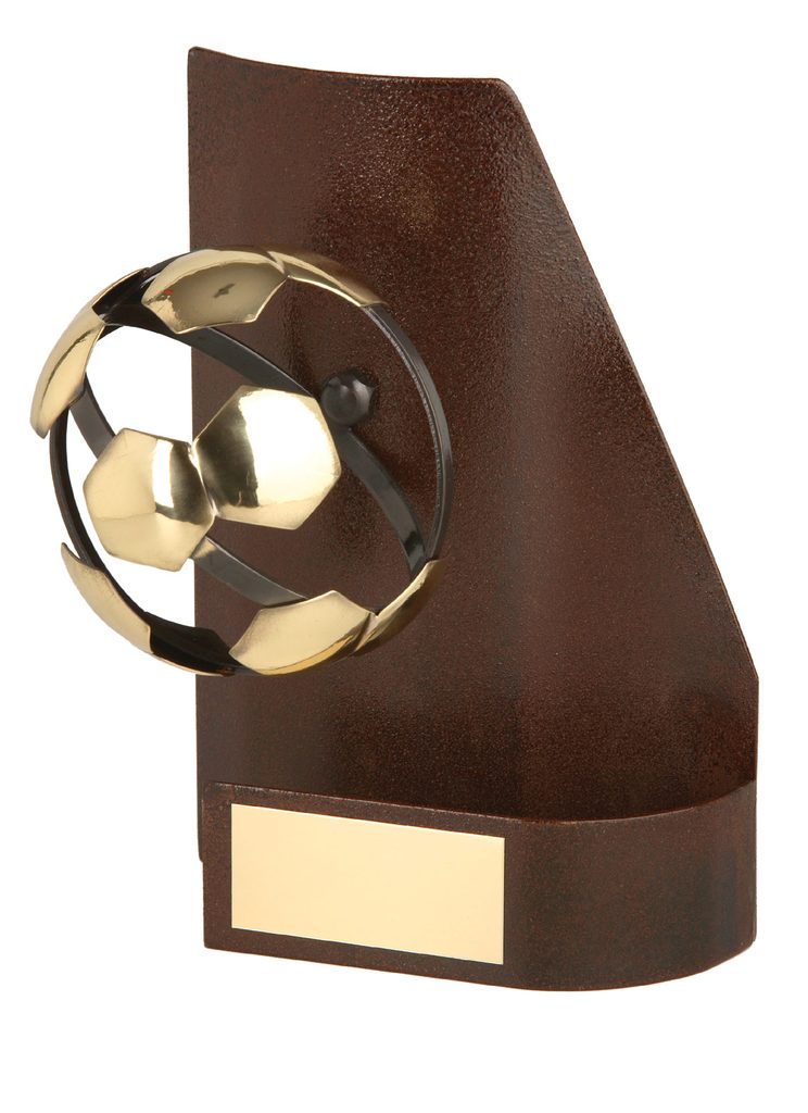 The Malaga Soccer ball Trophy is an exclusive handmade design showing a gold Champions League style Soccer ball fixed onto a stylish metallic backdrop. This is then mounted onto a marble effect wooden base. The award is part of an exclusive collection of awards that are handmade in Barcelona, Spain. Each trophy is hand crafted from high quality metals, including brass, copper, nickel, pewter and steel and are set upon either wooden or marble bases.