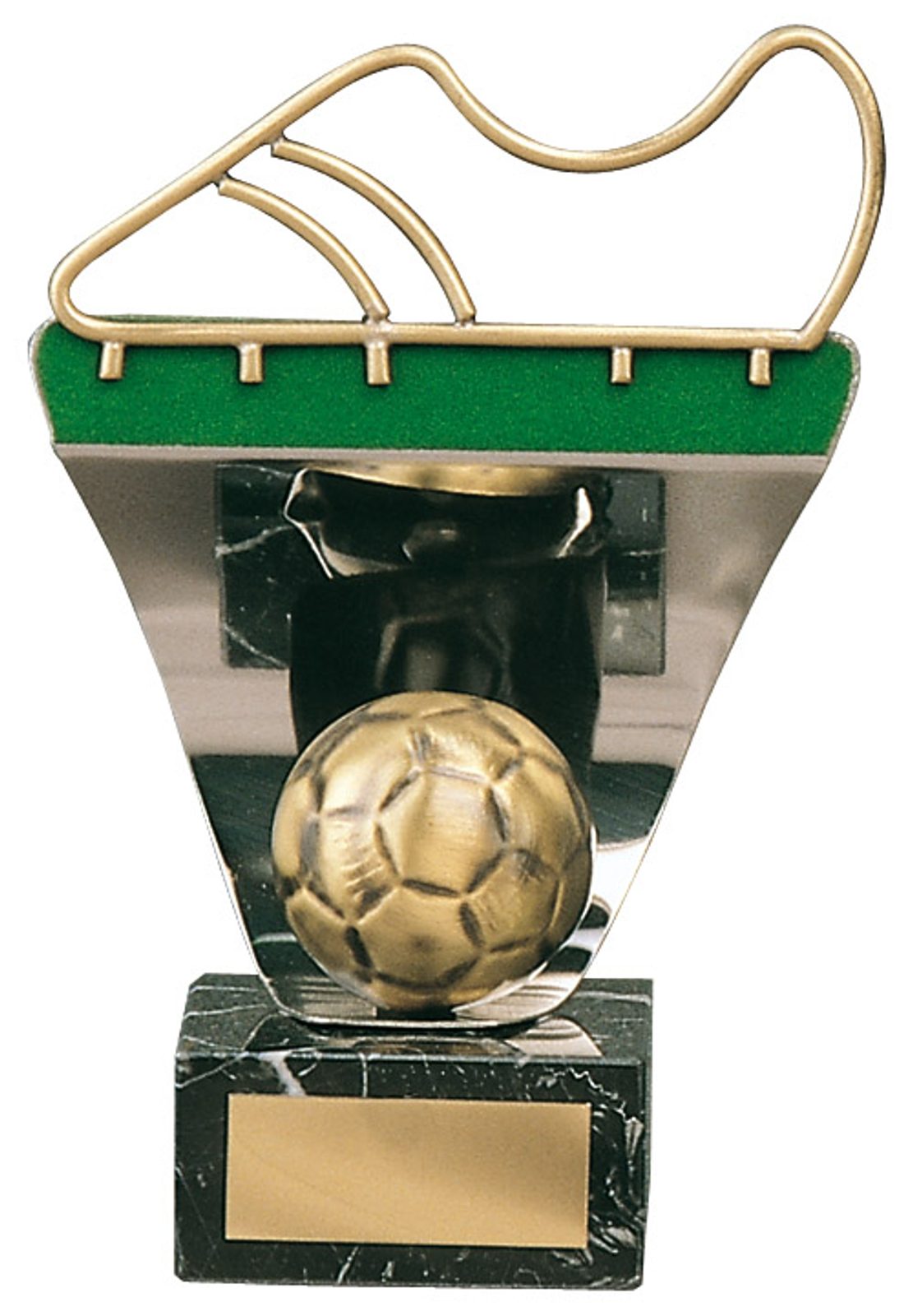 The Melilla Soccer ball Trophy is an exclusive handmade design displaying a golden boot on a topped green felt metal backdrop and ball. This is then mounted onto a high quality black marble base. The award is part of an exclusive collection of awards that are handmade in Barcelona, Spain. Each trophy is hand crafted from high quality metals, including brass, copper, nickel, pewter and steel and are set upon either wooden or marble bases.