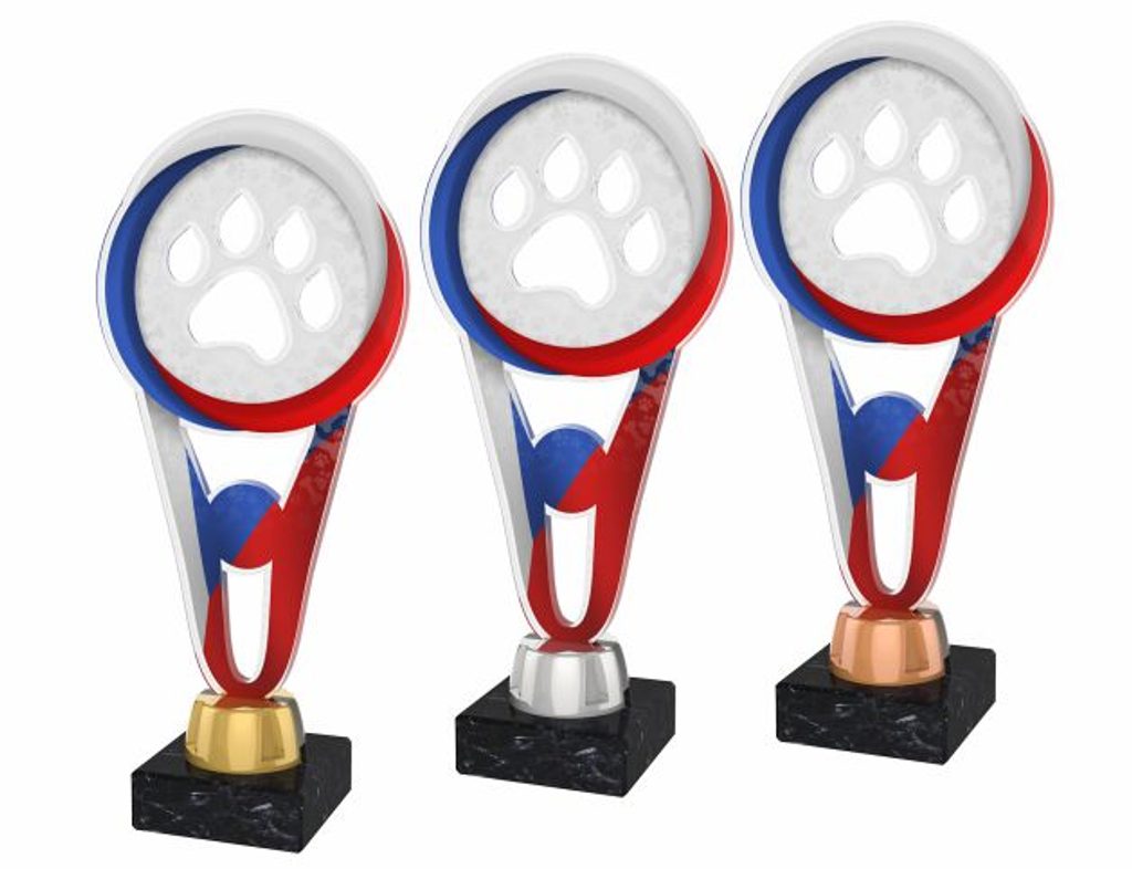 The Milan Paw Print Red and Blue Trophy is a modern take on a classic. Cut to shape, this award features a double sided full color print on the   1/4" thick acrylic and then is mounted onto a black marble base. Select a gold, silver or bronze riser that sits on the base