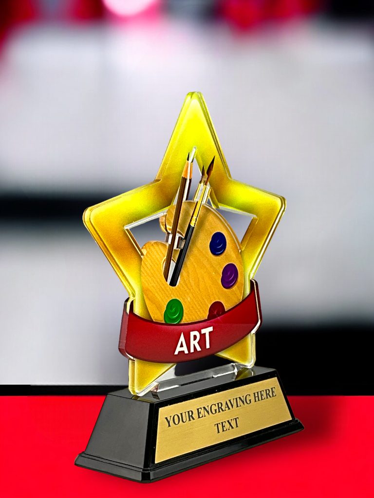 The Mini Star Art Trophy is part of a brand new exciting school subject range, designed exclusively by Trophy Monster. Based on the popular children's classic trophy we have brought it up to date with innovation using contemporary images. We have also created bigger sizes, the MAXI STAR and SUPER MAXI STAR. Each size star comes in gold, silver or bronze too.