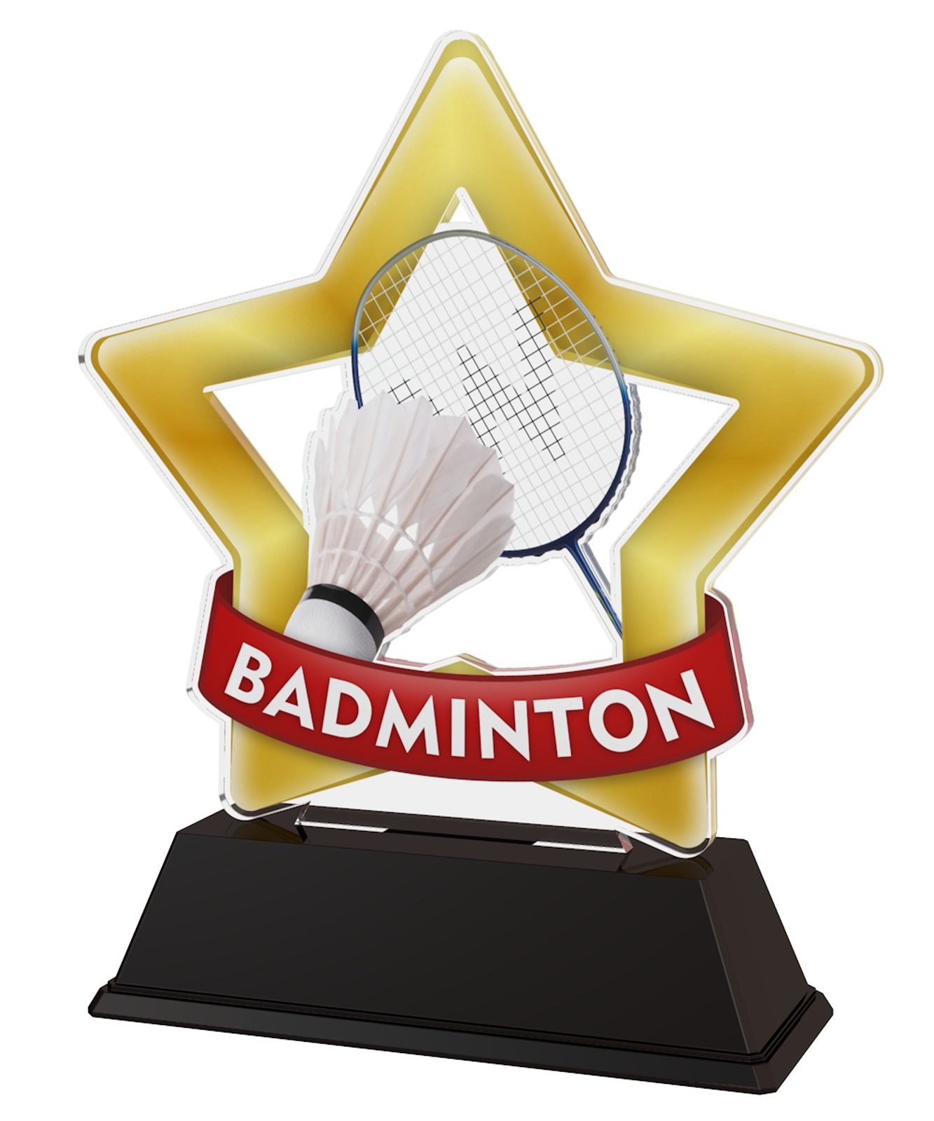 The Mini Star Badminton Trophy is part of a brand new exciting star range, designed exclusively by Trophy Monster. Based on the popular children's classic trophy we have brought it up to date with innovation using contemporary images. We have also created bigger sizes, the MAXI STAR and SUPER MAXI STAR. Each size star comes in gold, silver or bronze too.