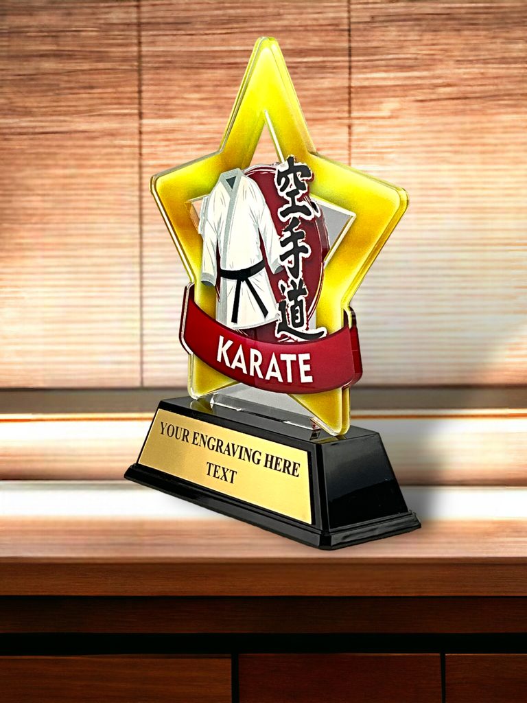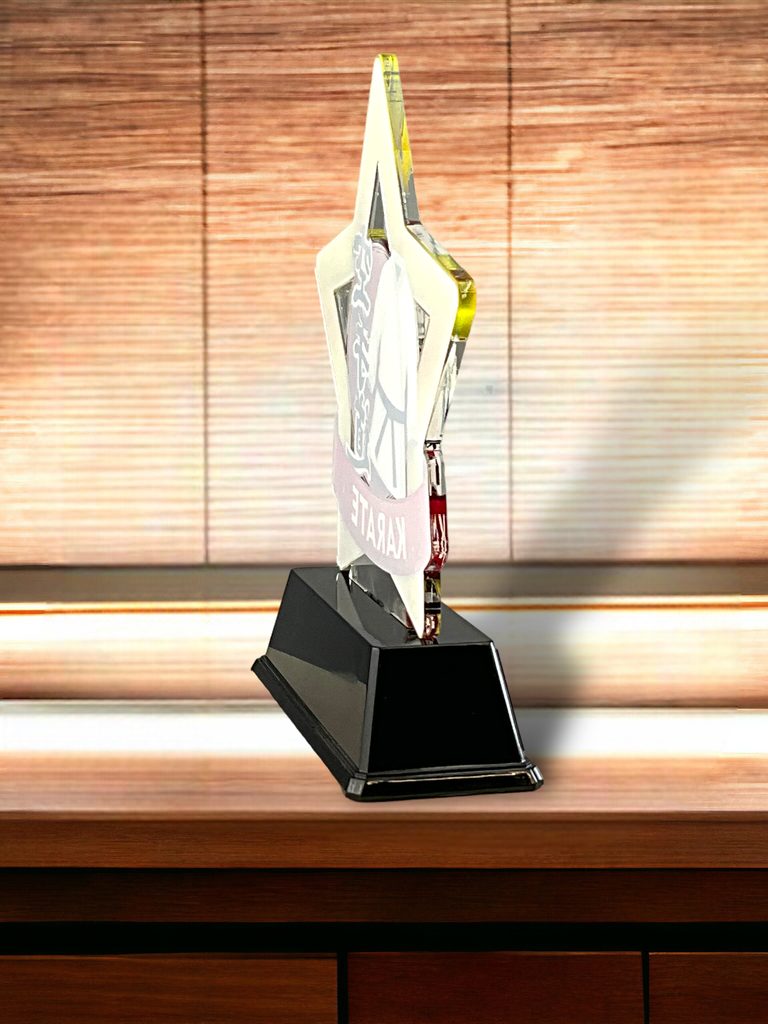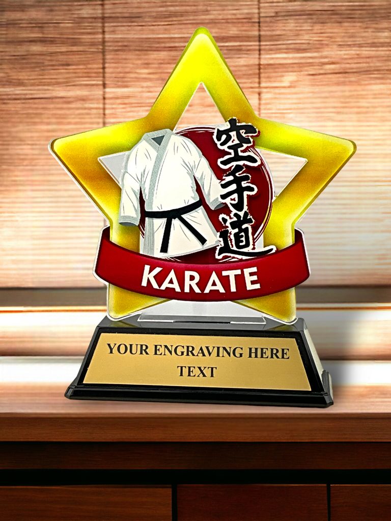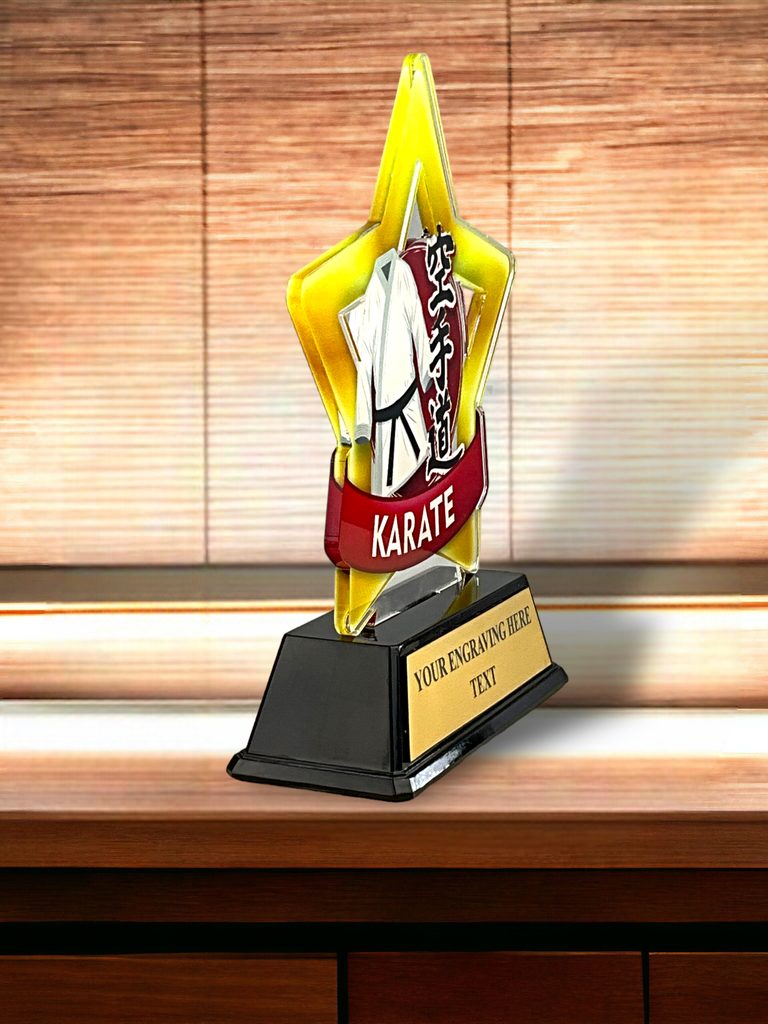 Cut out to shape this trophy comes to life with a high quality full colour print on the reverse side of the 5/32" thick acrylic. This is then mounted onto a black PVC base. In addition, the award also comes with a FREE engraved self adhesive plate with text of your choice. A special martial arts presentation.