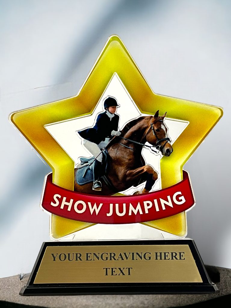 The Mini Star Show Jumping Trophy is part of a brand new exciting star range, designed exclusively by Trophy Monster. Based on the popular children's classic trophy we have brought it up to date with innovation using contemporary images. We have also created bigger sizes, the MAXI STAR and SUPER MAXI STAR. Each size star comes in gold, silver or bronze too.