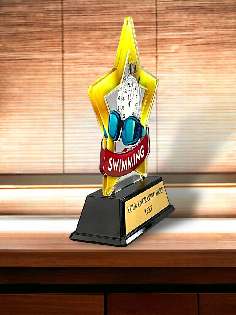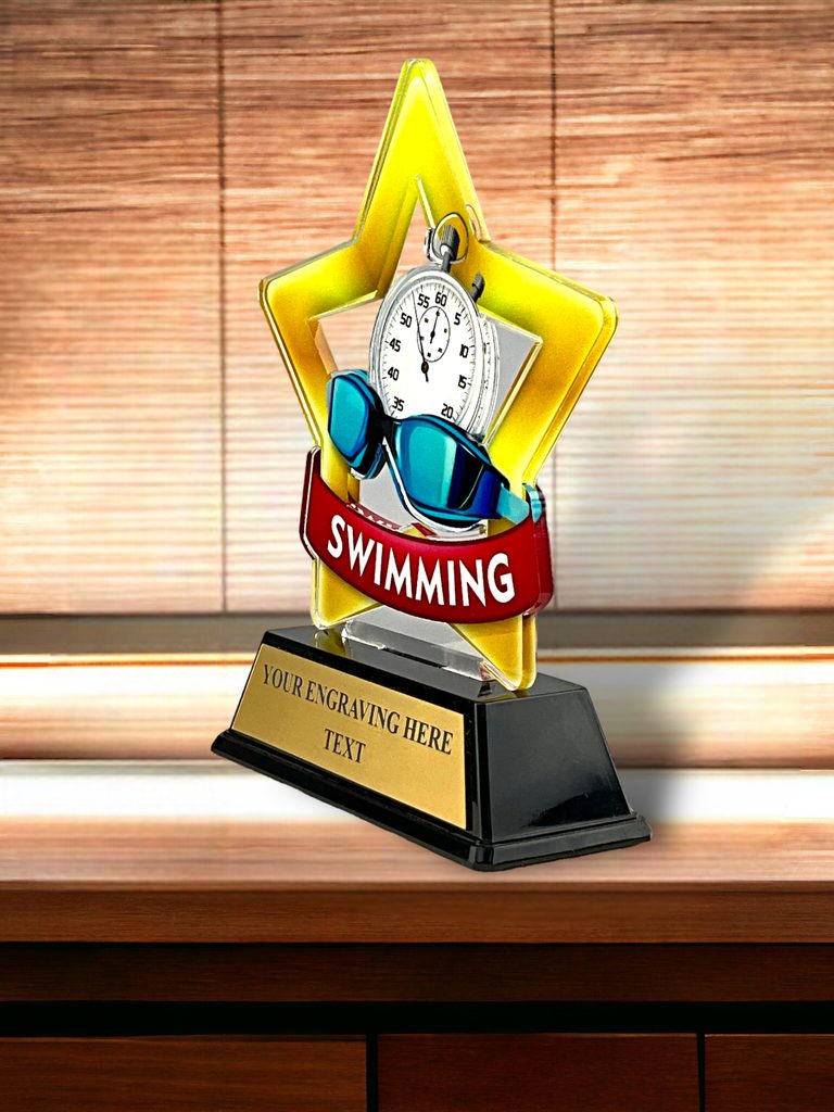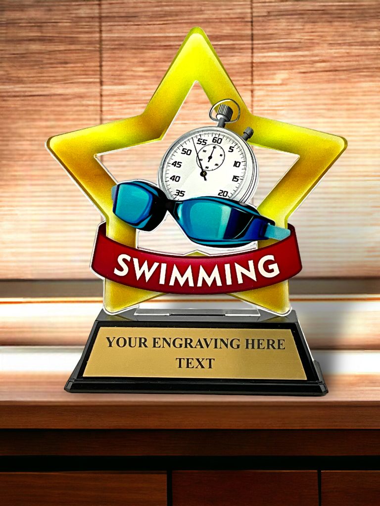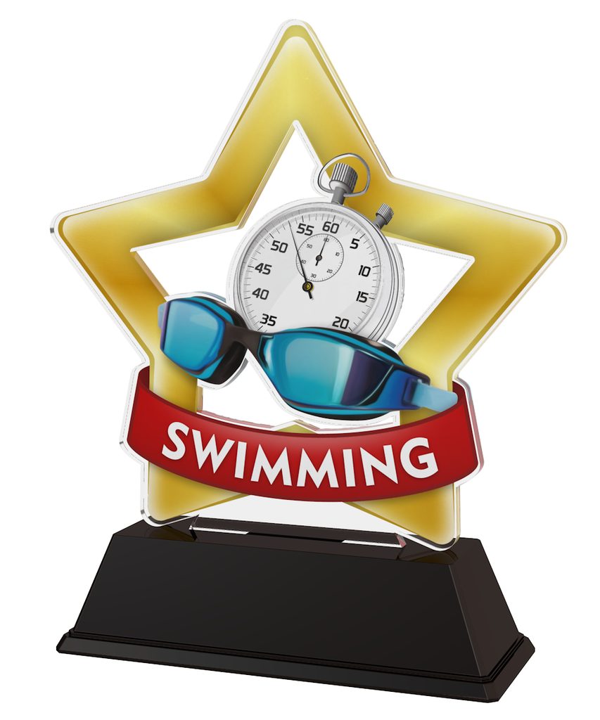The Mini Star Swimming Trophy is part of a brand new exciting star range, designed exclusively by Trophy Monster. Based on the popular children's classic trophy we have brought it up to date with innovation using contemporary images. We have also created bigger sizes, the MAXI STAR and SUPER MAXI STAR. Each size star comes in gold, silver or bronze too.