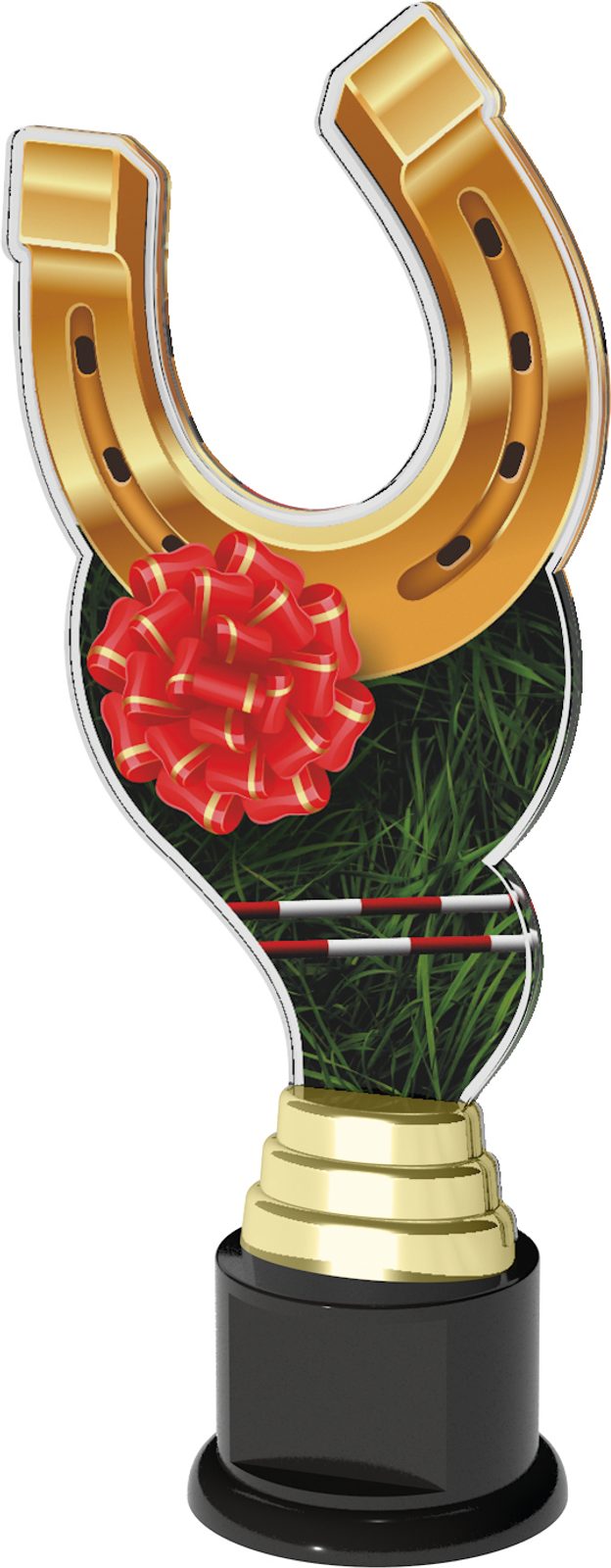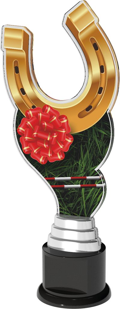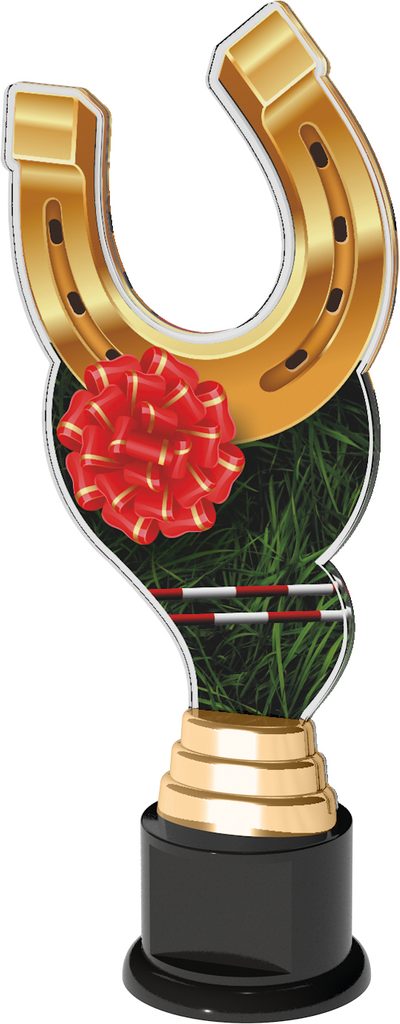 The Monaco Horseshoe Rosette Trophy is a tall modern style award. Cut to shape this trophy features a high quality full color print on the reverse side of the 1/4" thick acrylic mounted on a large round black PVC base. Just above the base sits a riser. Please select which color riser you like from gold, silver or bronze.