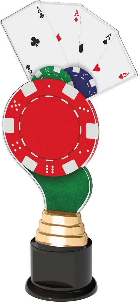 The Monaco Poker Trophy is a tall modern style award. Cut to shape this trophy features a high quality full color print on the reverse side of the 1/4" thick acrylic mounted on a large round black PVC base. Just above the base sits a riser. Please select which color riser you like from gold, silver or bronze.