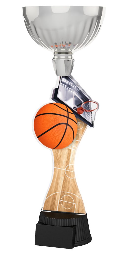 The Montreal Basketball Silver Cup Trophy will be the centerpiece in any presentation. This trophy features a high quality full color  print on the reverse side of 1/4”  acrylic, with a gold metal cup, all mounted on a circular and weighted black PVC base.