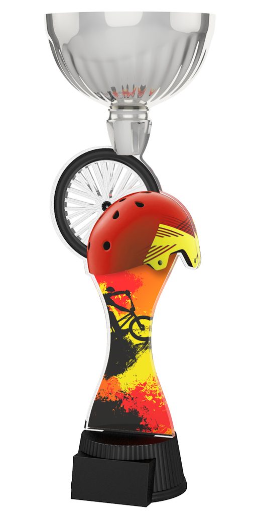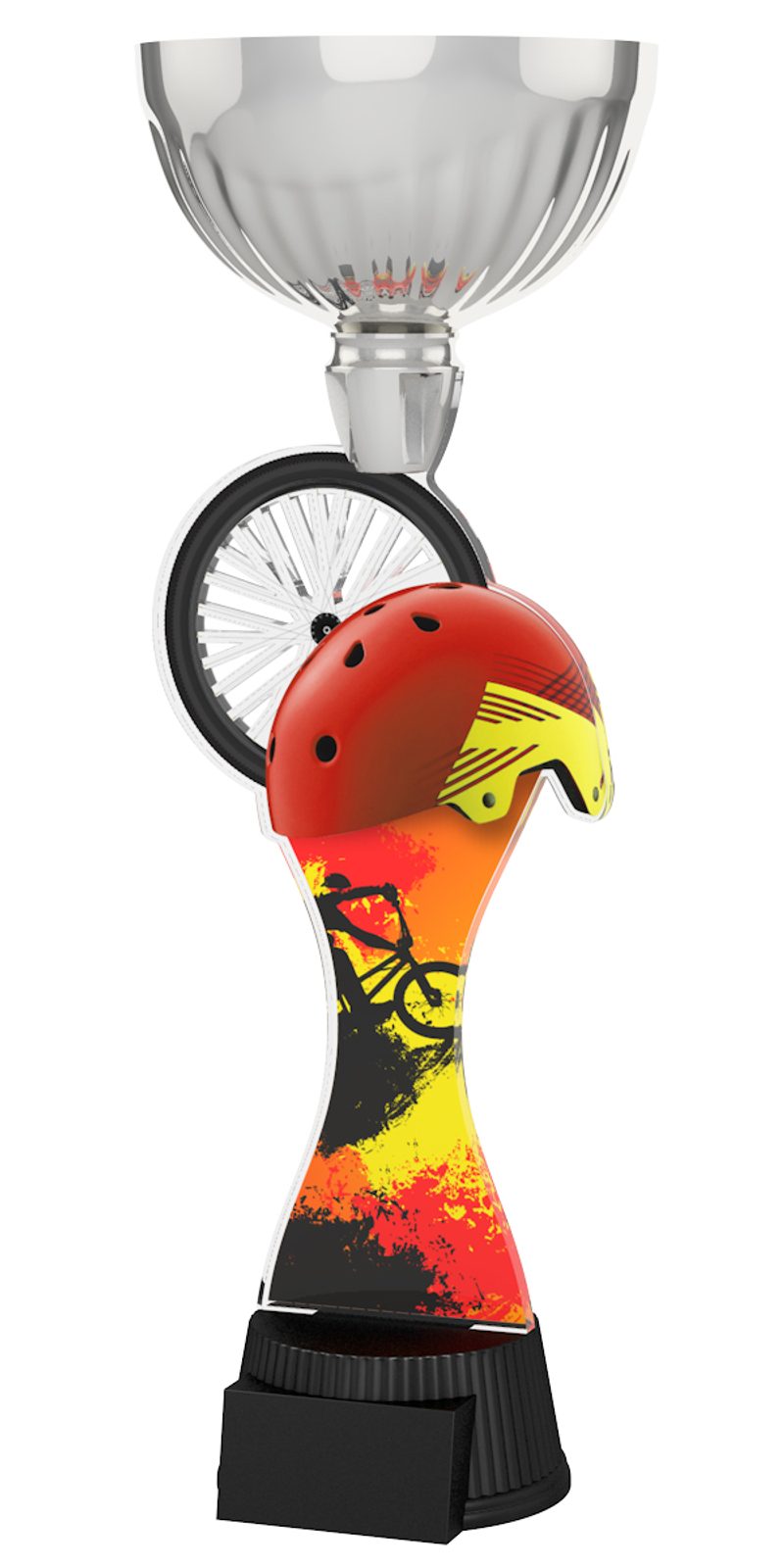The Montreal BMX Silver Cup Trophy will be the centerpiece in any presentation. This trophy features a high quality full color print on the reverse side of 1/4”  acrylic, with a gold metal cup, all mounted on a circular and weighted black PVC base.
