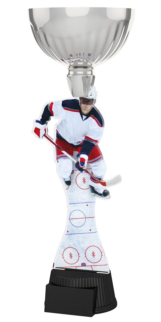 The Montreal Ice Hockey Player Silver Cup Trophy will be the centerpiece in any presentation. This trophy features a high quality full color print on the reverse side of 1/4” acrylic, with a gold metal cup, all mounted on a circular and weighted black PVC base.