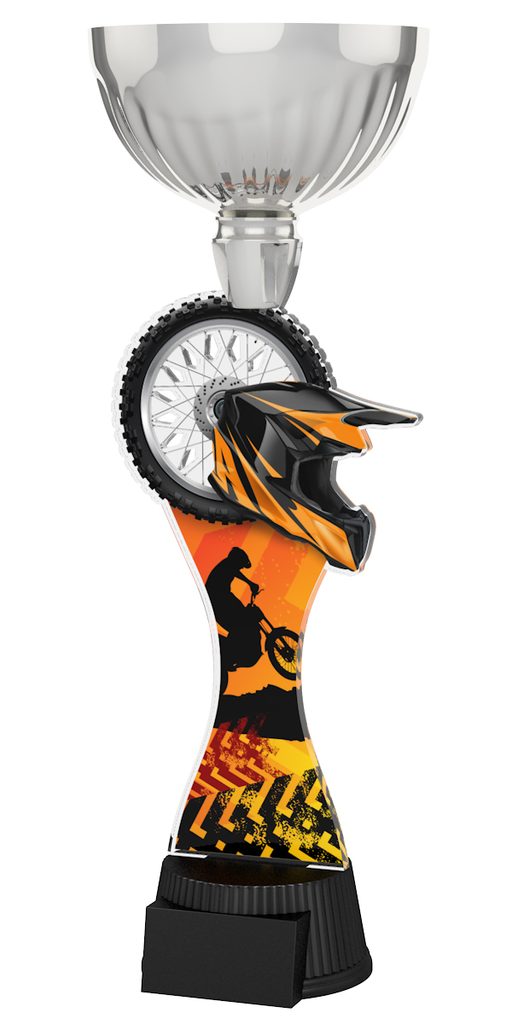 The Montreal Speedway Silver Cup Trophy will be the centerpiece in any presentation. This trophy features a high quality full color print on the reverse side of 1/4” acrylic, with a gold metal cup, all mounted on a circular and weighted black PVC base.