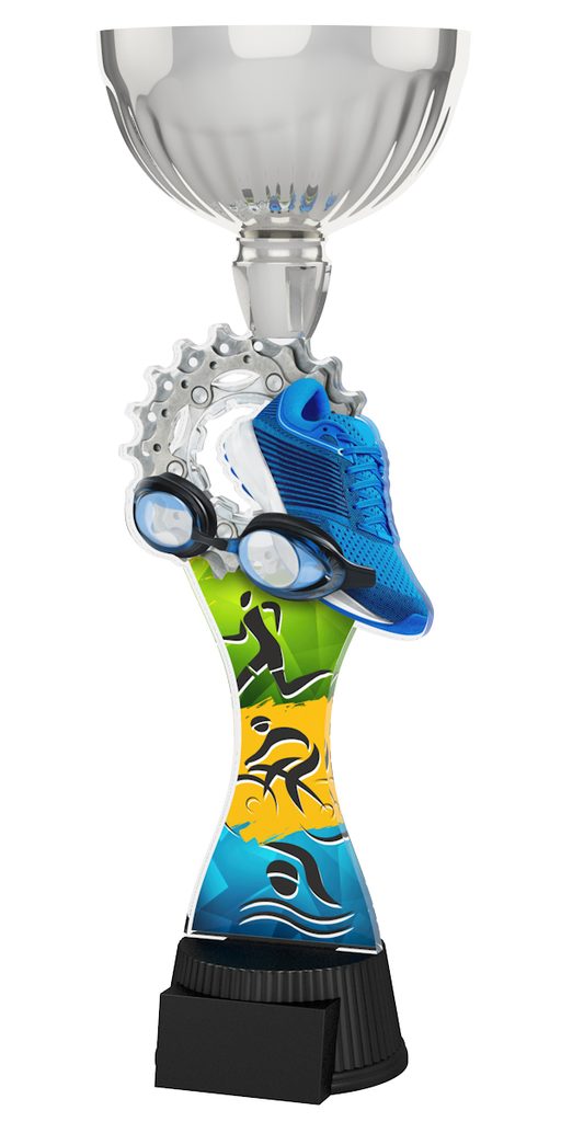 The Montreal Triathlon Silver Cup Trophy will be the centerpiece in any presentation. This trophy features a high quality full color print on the reverse side of 1/4” acrylic, with a gold metal cup, all mounted on a circular and weighted black PVC base.
