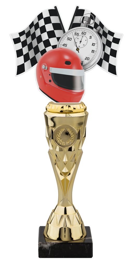 The Motorsports Helmet Flags Acrylic Top Trophy is the latest in contemporary design. Watch eyes light up when presenting this award, with the high quality full colour print on the reverse side of 4mm thick acrylic mounted on an attractive gold plastic column, which itself is mounted on a black marble base.