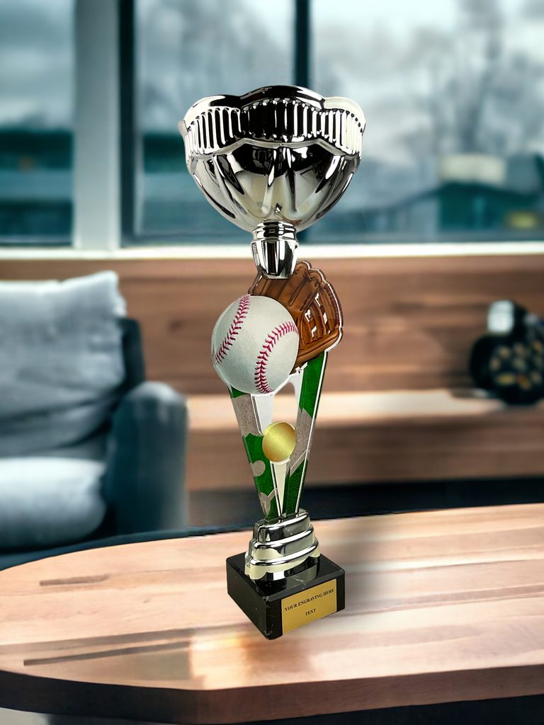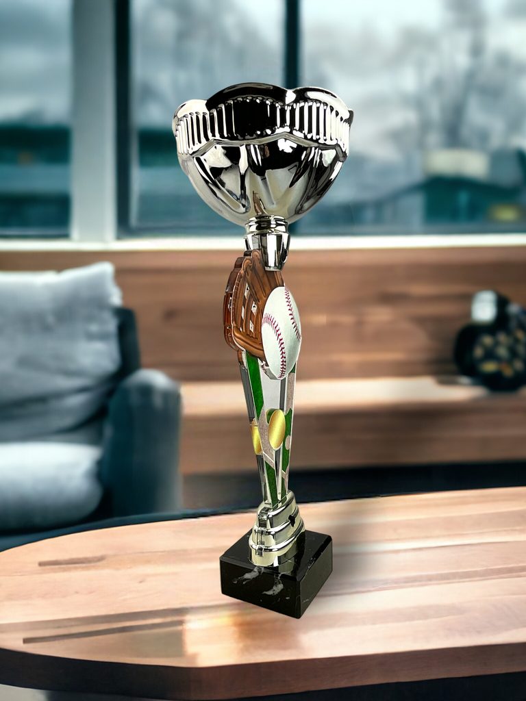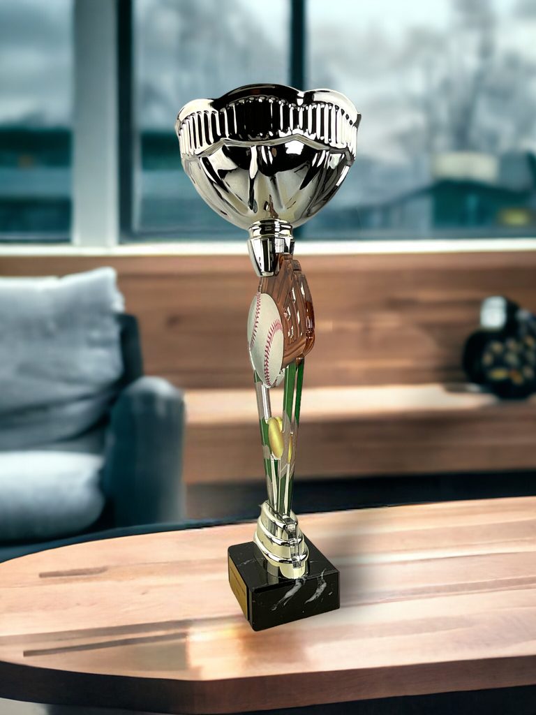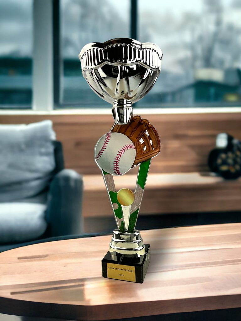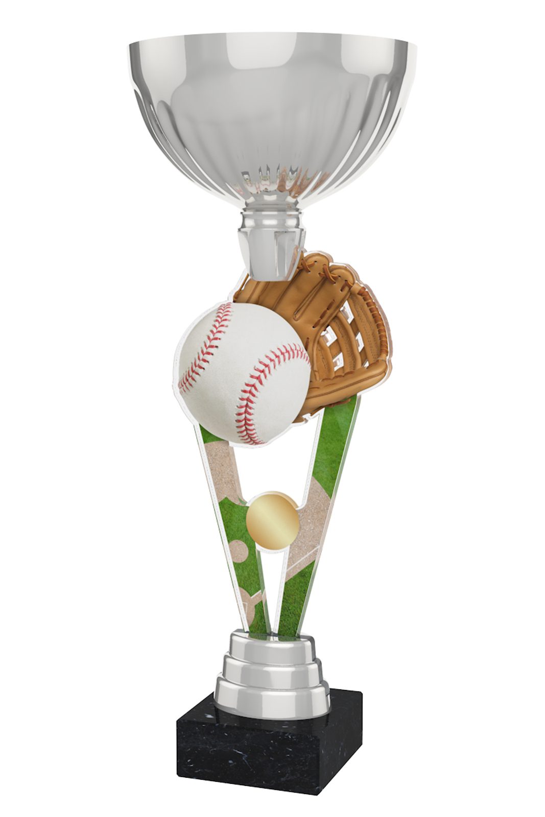 The Napoli Baseball Silver Cup Trophy has a centerpiece featuring a double-sided full-color print on 1/4" thick acrylic. Fixed to a metal bowl, the cup is then mounted onto a black marble base. Please select which color riser you like gold, silver, or bronze. The riser sits just above the base.