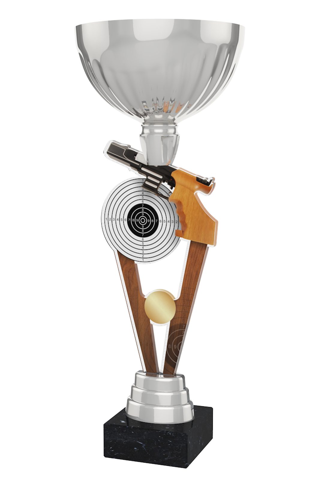 The Napoli Pistol Shooting Silver Cup Trophy has a centrepiece featuring a double sided full color print on 0.25" thick acrylic. Fixed to a metal bowl, the cup is then mounted onto a black marble base. Please select which color riser you like from gold, silver or bronze. The riser sits just above the base.