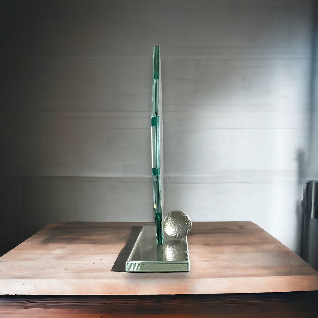 The Navarre Glass Golf Awardis very high quality 1/4" thick heavy beveled glass crystal trophy. It features a 3D crystal golf ball mounted on a solid glass base.