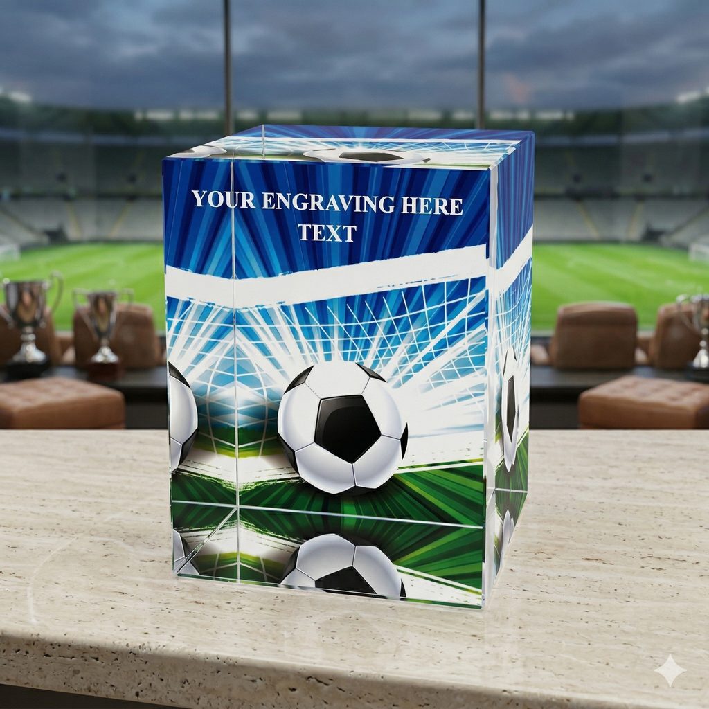 Elevate your victory with a stunning piece of modern sports memorabilia. This premium crystal cube features a high-definition, multi-dimensional soccer graphic, capturing the intensity of the pitch. Designed with a unique "rear-print" technique, the image gains incredible depth and clarity, making it a standout centerpiece for any trophy case or office desk.