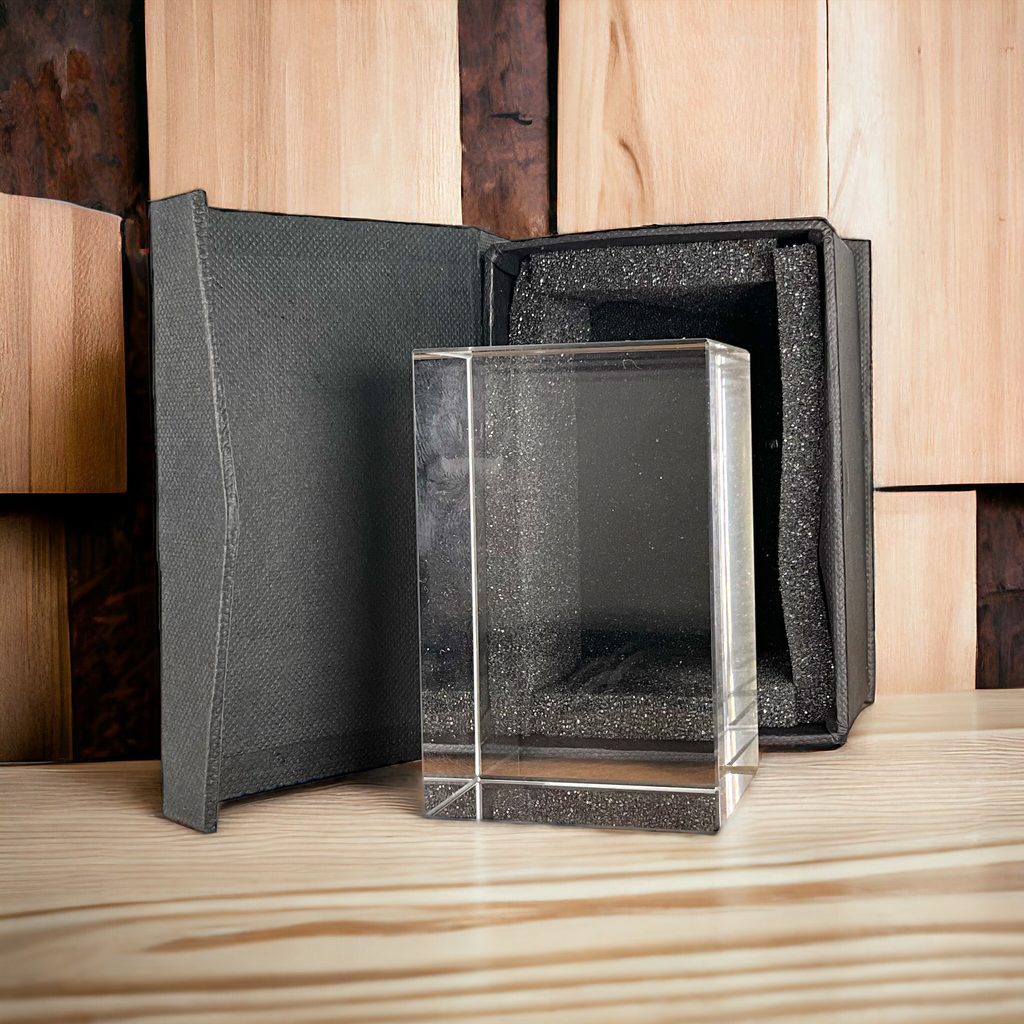 The Nolan Optical Crystal Cube trophy is a stunning example of how a simple piece of glass can be transformed with a full-colour background print.