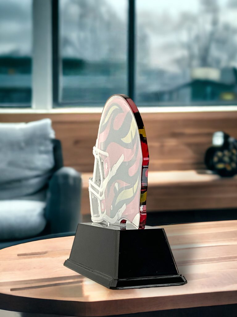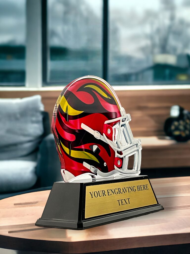 The Oakland American Football Helmet Trophy is superb modern award. Cut to shape this trophy features a high quality full color print on the reverse side of the 5/32" thick acrylic mounted on a black PVC base.