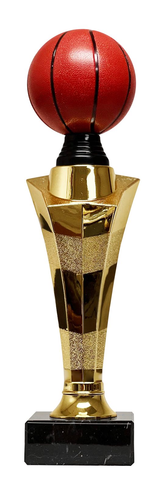 The Ohio Basketball Trophy a tall stylish figure-mounted trophy. The 3D color figure is fixed to a gold column structure and mounted onto a weighted black marble base.