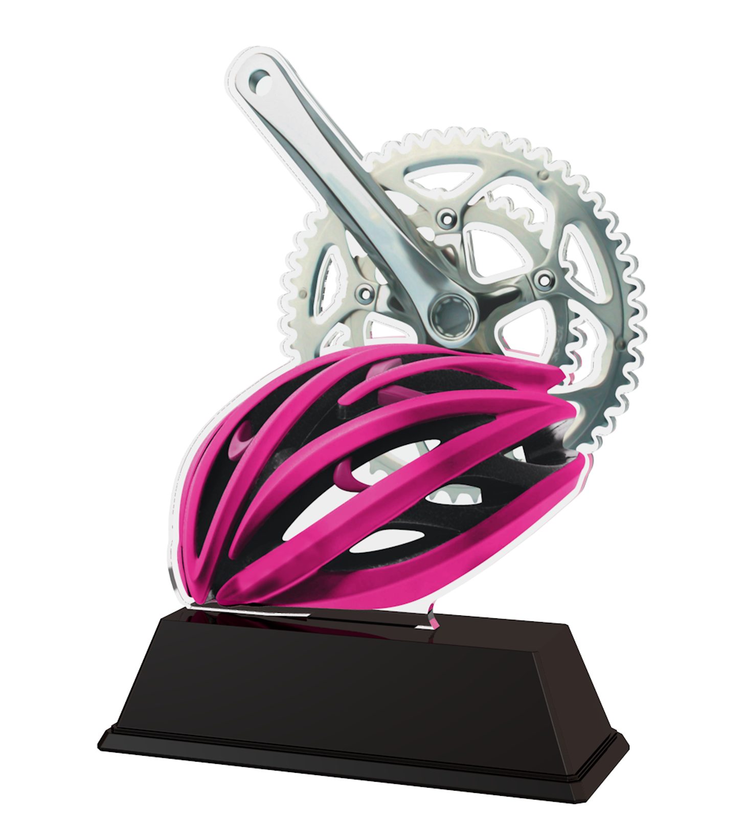 The Ostrava Pink Cycling Trophy is superb modern award. Cut to shape this trophy features a high quality full color print on the reverse side of the 5/32"thick acrylic mounted on a black PVC base.