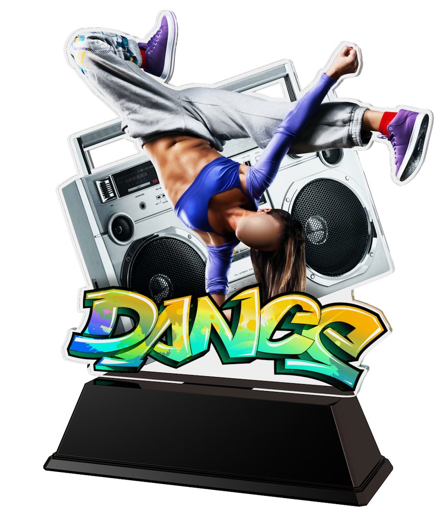 The Ostrava Street Dance Trophy is superb modern award. Cut to shape this trophy features a high quality full color print on the reverse side of the 5/32"thick acrylic mounted on a black PVC base.