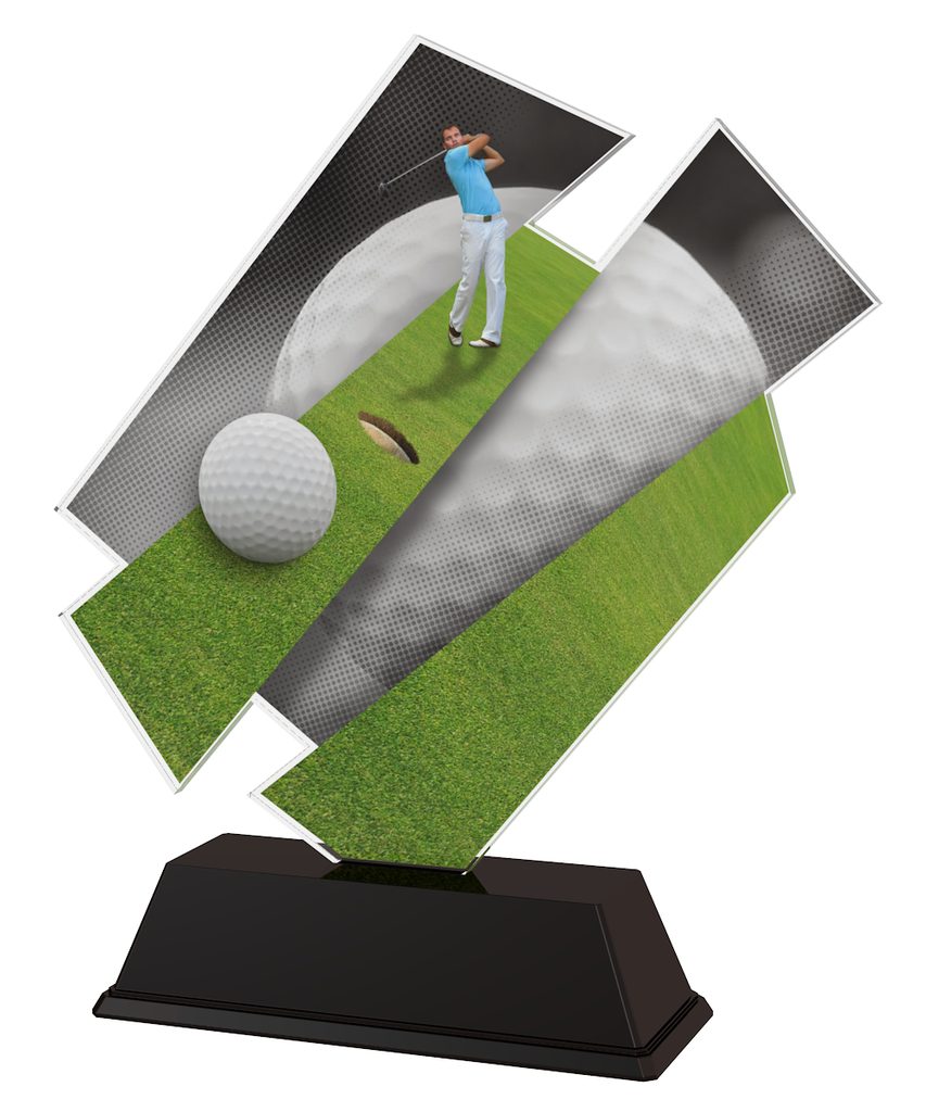 The Trophy is contemporary artistic award. Cut to shape this trophy has a high quality full color print on the reverse side of the 5/32" thick acrylic mounted on a black PVC base.