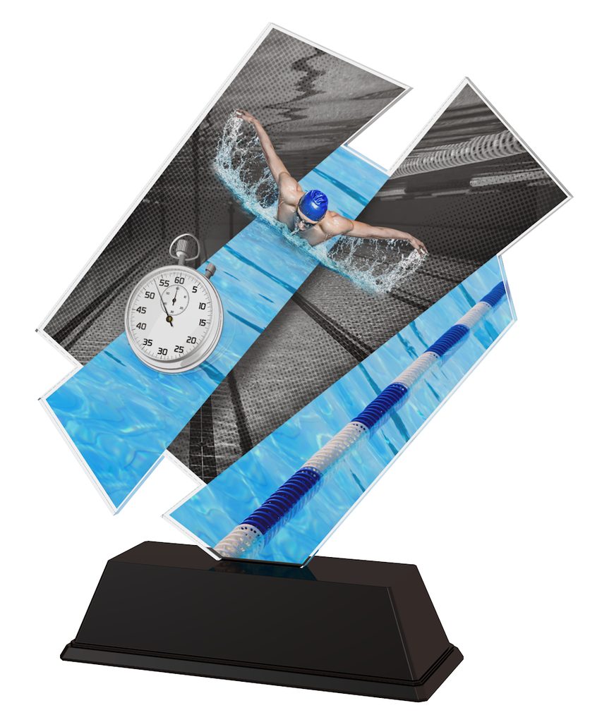 The Trophy is contemporary artistic award. Cut to shape this trophy has a high quality full color print on the reverse side of the 5/32" thick acrylic mounted on a black PVC base.