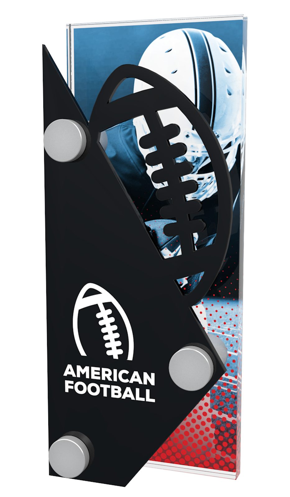 The Pittsburgh American Football Trophy is made from two pieces of acrylic. These are connected by using three steel screw fittings. The back piece is a 3/8"thick piece of high quality printed acrylic, and the front piece is laser cut black acrylic.