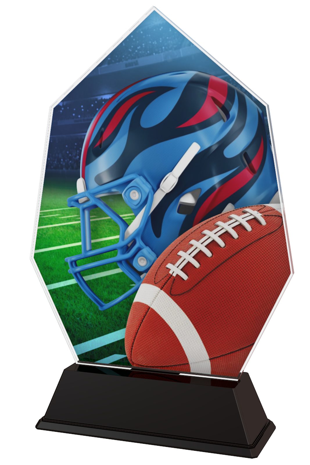 The Portland American Football Helmet Trophy is a striking and impressive award. Expertly cut to shape, this trophy comes to life with a high quality full color double sided print on 1/8" thick acrylic mounted on a black PVC base.