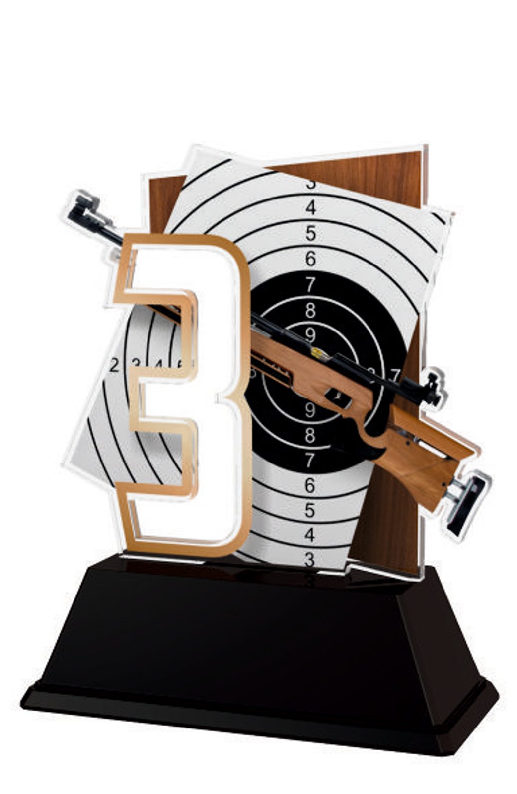 The Poznan Air Rifle Number Trophy is a modern take on a classic style award for 1st, 2nd, 3rd place. Cut to shape this trophy features a high quality full color print on the reverse side of the 1/8"  thick acrylic mounted on a black PVC base.