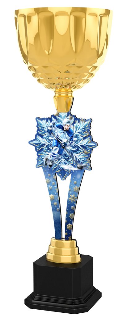 The front of the column features a vibrant full-color UV print with a 2D effect, available in a variety of themed designs including winter, festive, sports, and more. The gleaming gold cup on top adds a bold finishing touch, making this trophy perfect for sports tournaments, school competitions, corporate awards, and seasonal events.